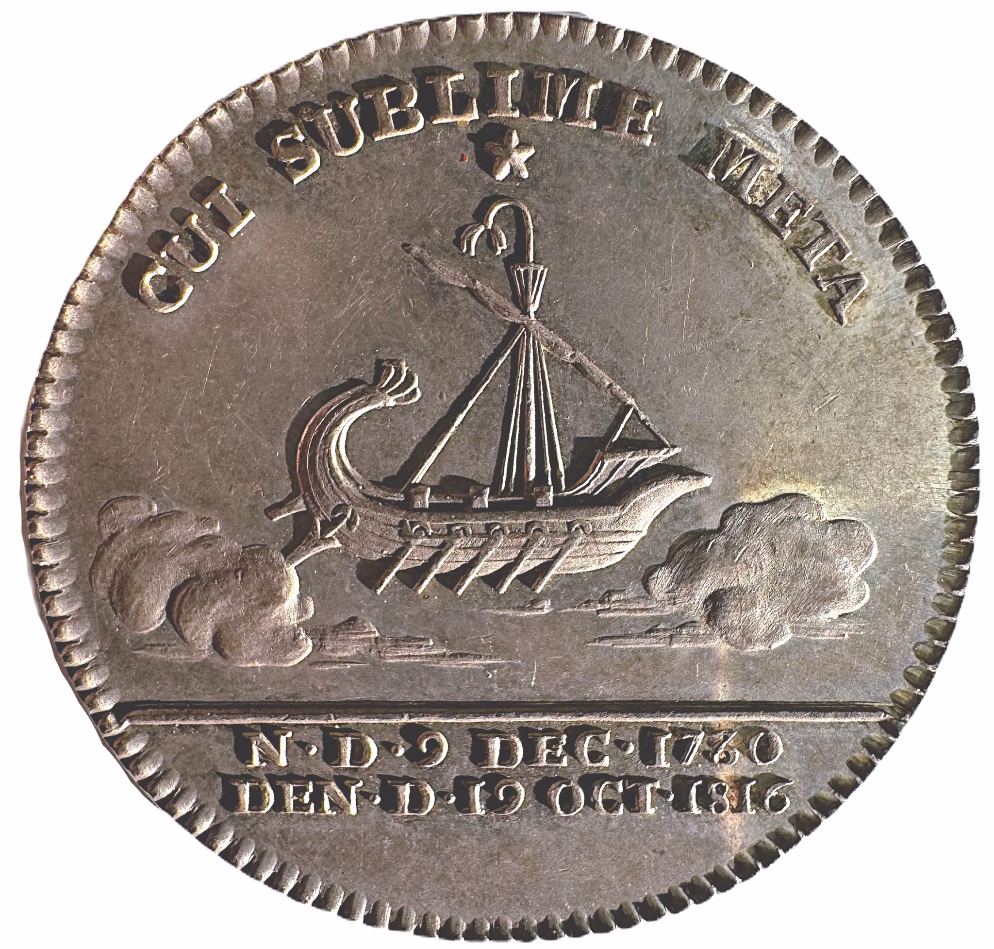 Skeppet Argo svävande ovan moln. Ovanför masttoppen en femuddig stjärna. Ovanför skeppet: "CUI SUBLIME META" (För den som har ett sublimt mål) och i avskärningen på två rader: "N D 9 DEC 1730 DEN D 19 OCT. 1816"