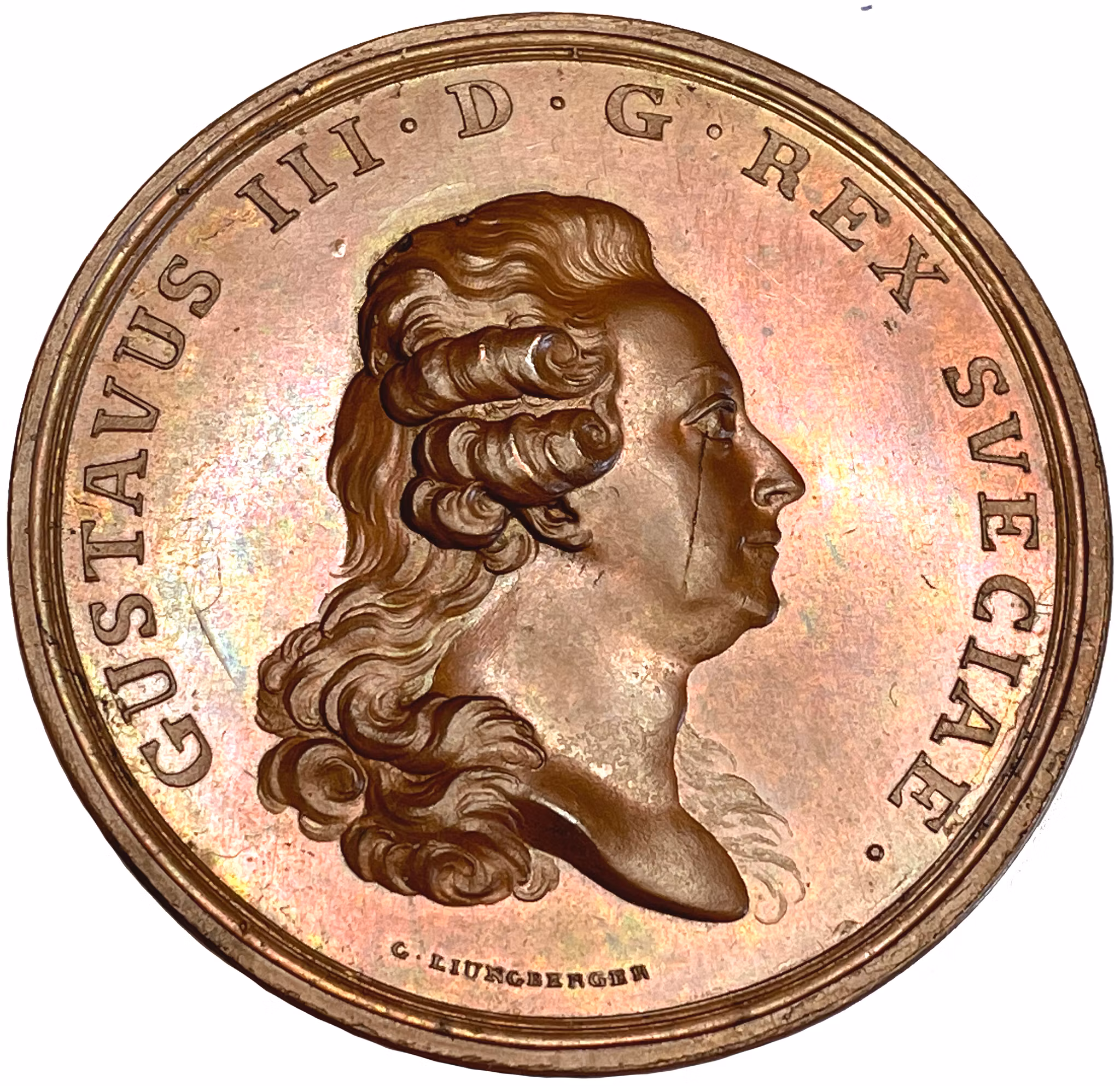 Konungens högervända bröstbild med långt utslaget hår uppkastat över bröstkanten. I omskriften: "GUSTAVUS III D. G. REX SVECIAE". Nedanför bilden gravörens namn: "G. LIUNGBERGER"