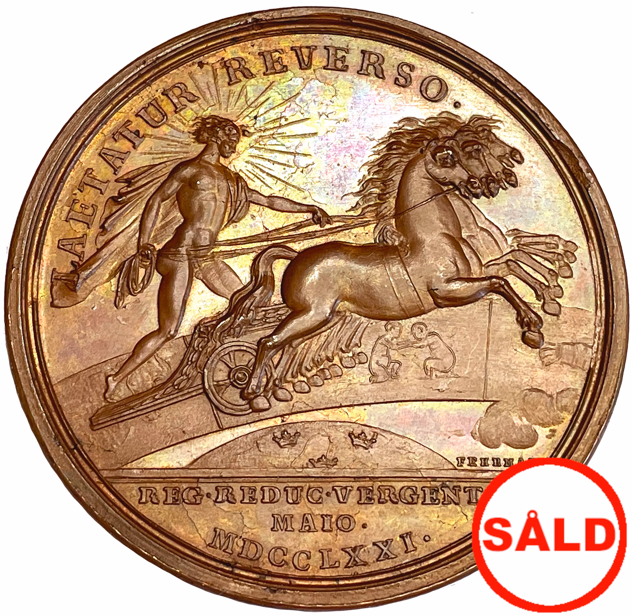 Solguden med strålande huvud, åker med sitt fyrspann över tvillingarnes tecken på zodiaken. Nedanför ett litet med tre kronor tecknat segment av jordklotet. I omskriften: " LAETATUR REVERSO" och i avskärningen: "REG. REDUC. VERGENTE MAIO. MDCCLXXI". Ovanför avskärningslinjen till höger, gravörens namn: "FEHRMAN." Hela texten översatt lyder: "Den (solen) gläder sig över att han har återvänt - När konungen återvänt i slutet av maj 1771."