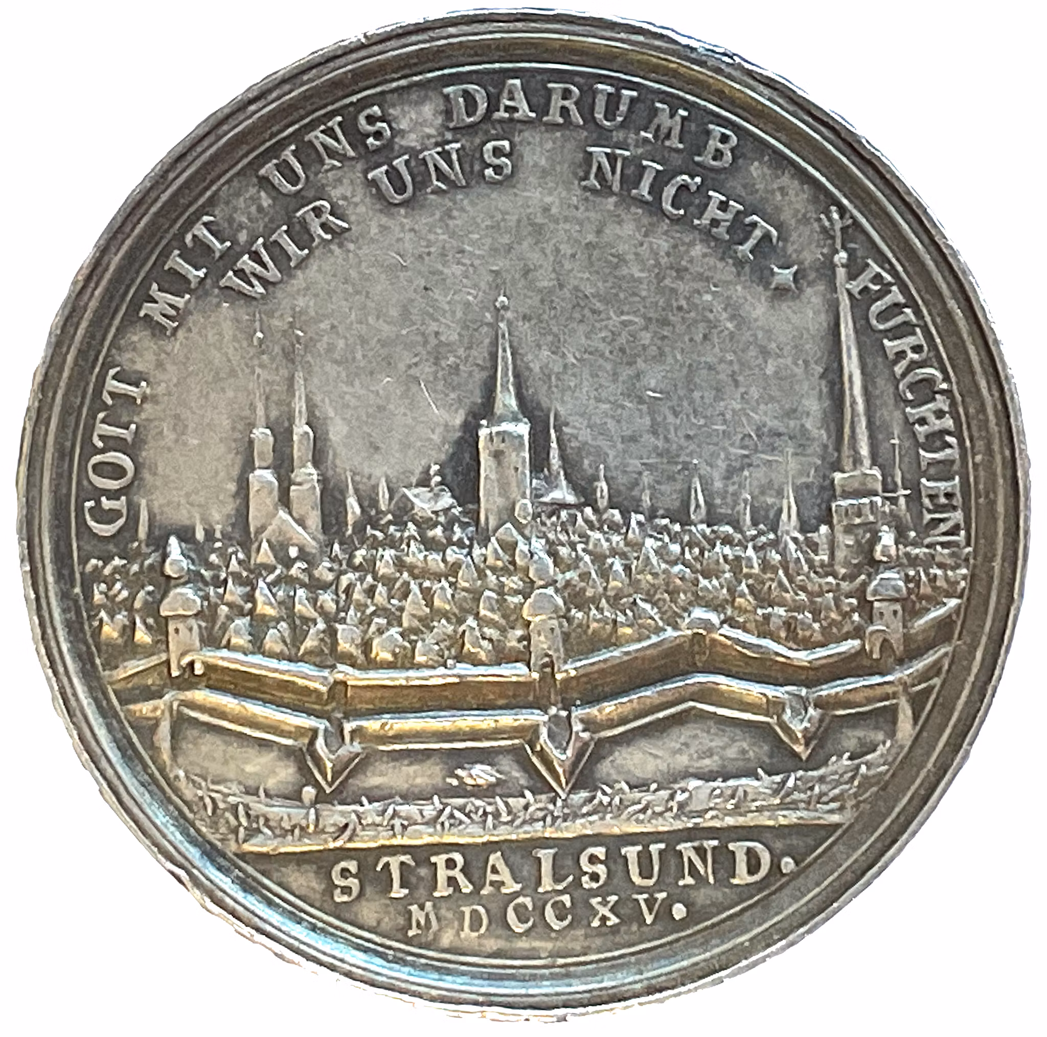 De belägrade staden Stralsund med omgivande fästningsverk. I omskriften: "GOTT MIT UNS DARUMB FURCHTEN WIR UNS NICHT." och i avskärningen: "STRALSUND. MDCCXV." Texten översatt lyder: "Gud är med oss. Därför fruktar vi inte. - Stralsund 1715"