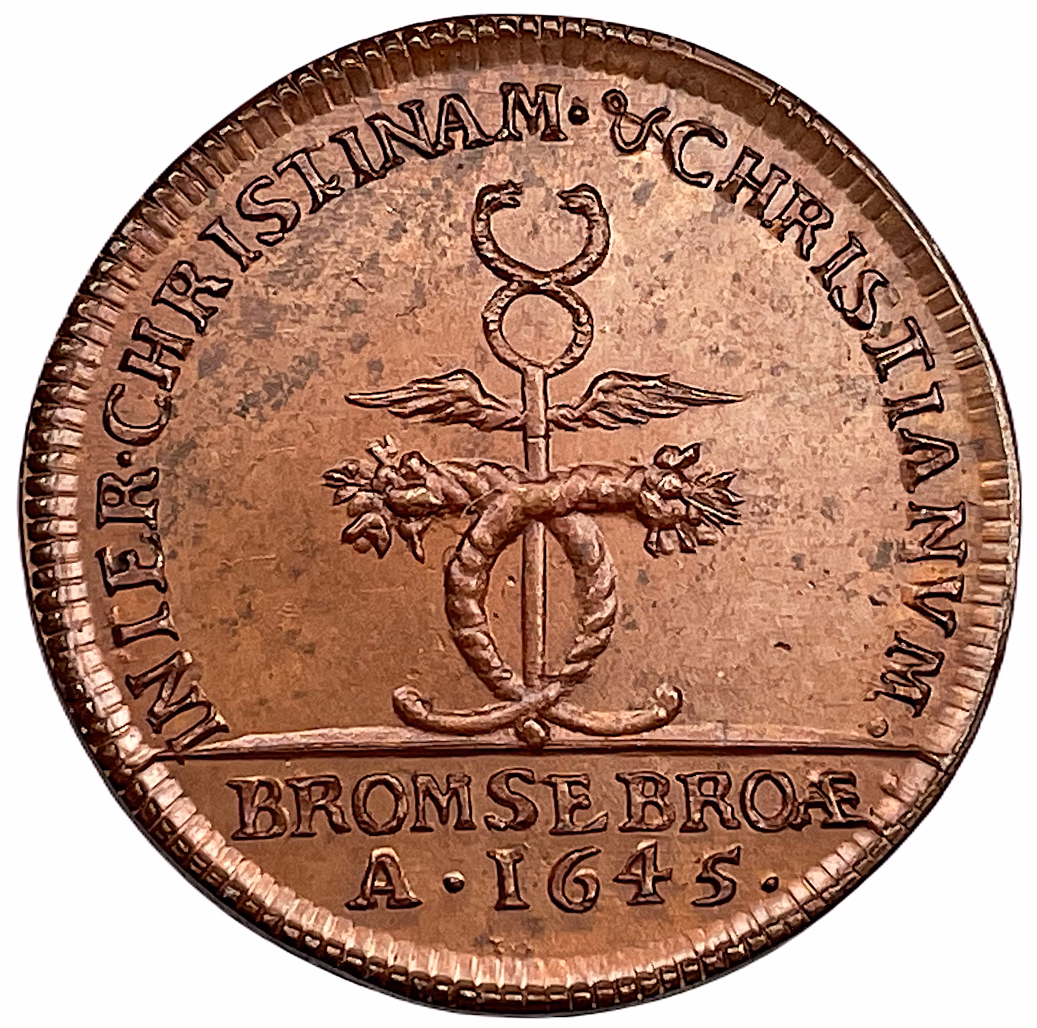 Två ymnighetshorn ställda i form av ett dubbelt C, Merkuriistav i mitten. I omskriften: "INTER•CHRISTINAM• & CHRISTIANVM•" och i avskärningen: "BROMSEBROÆ• / A•1645•"