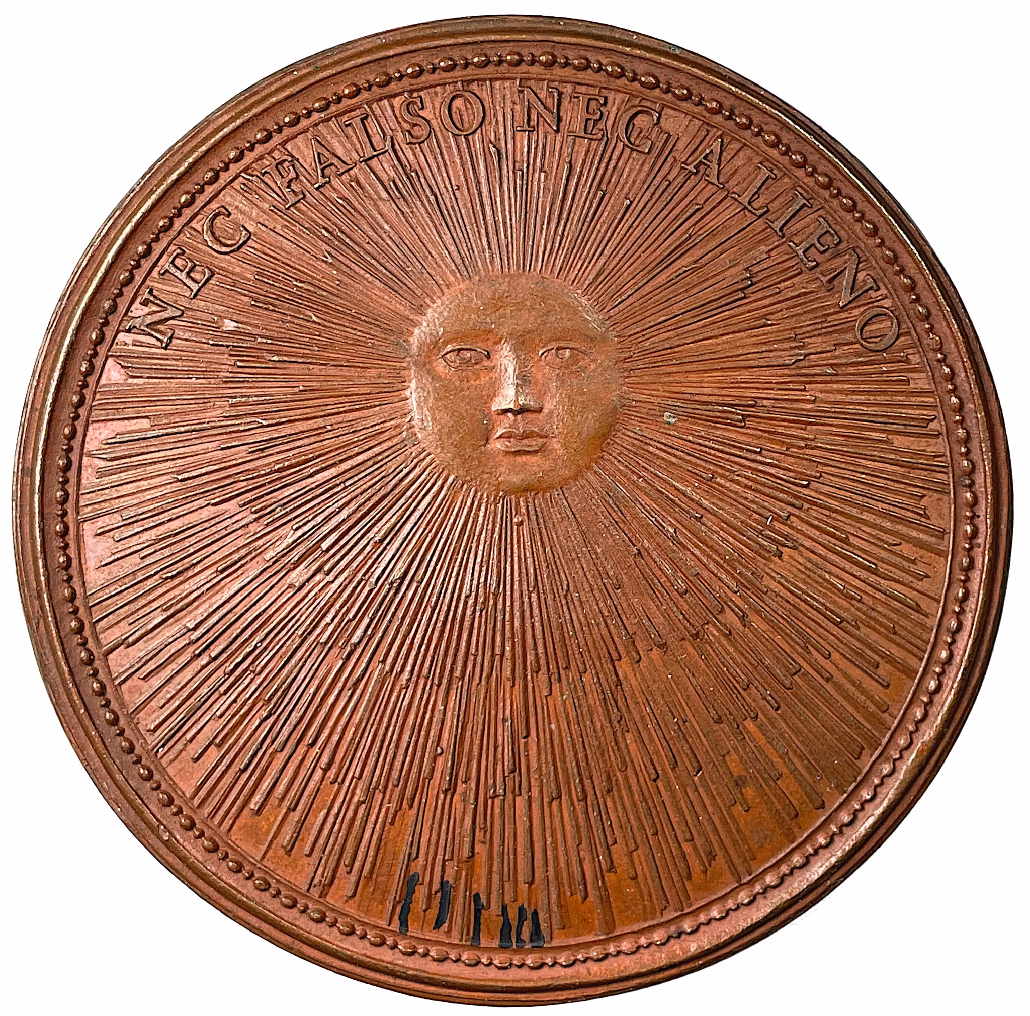 Ett mycket vackert och praktfullt exemplar, tekniskt ocirkulerad, med full präglingsglans och endast obetydliga märken av hantering och lätt kabinettsslitage på de högsta partierna. I den internationella databasen Coin Archives Pro (där de flesta större auktionsföretagens resultat finns arkiverade) har under de senaste ca 20 åren endast ett bronsexemplar noterats, vilket såldes av Baldwin 2010 för 340 pund ex köparprovision i kvalitet EF. Dessutom känner jag till ett bronsexemplar, som ingick i Thomas Lautz omfattande medaljsamling med nr 3363, vilken såldes tidigare på Mynthusets auktion 1990:1:38. Bronsmedaljen saknades helt i de två största medaljsamlingarna som sålts i modern tid: friherre Bondes samling respektive den del av Sven Svenssons samling som såldes 1966 och 1970 av Hirsch Mynthandel. När det gäller silvermedaljerna känner jag till följande försäljningar: AMS 2019: 30:361, Bonde 2008:145:7173 och Crona 1937:258. Det här utbjudan bronsexemplaret ingick i Sune Eberhard Cronas samling som såldes 1937 av Felix Schlessinger i Amsterdam och är sålunda det tredje av mig kända, enligt ovanstånde statistiska källor, som figurerat på marknaden i modern tid. Det här utbjudna exemplaret är synnerligen välbevarat, vackert och mycket sällsynt. Under bilden finns en liten samlarmärkning i form av en bläckskriven siffra 9. Graverad av Giovanni Battista Guglielmada. Kvalitet god 01, RR, 91.6g, 62mm. Hildebrand 97.