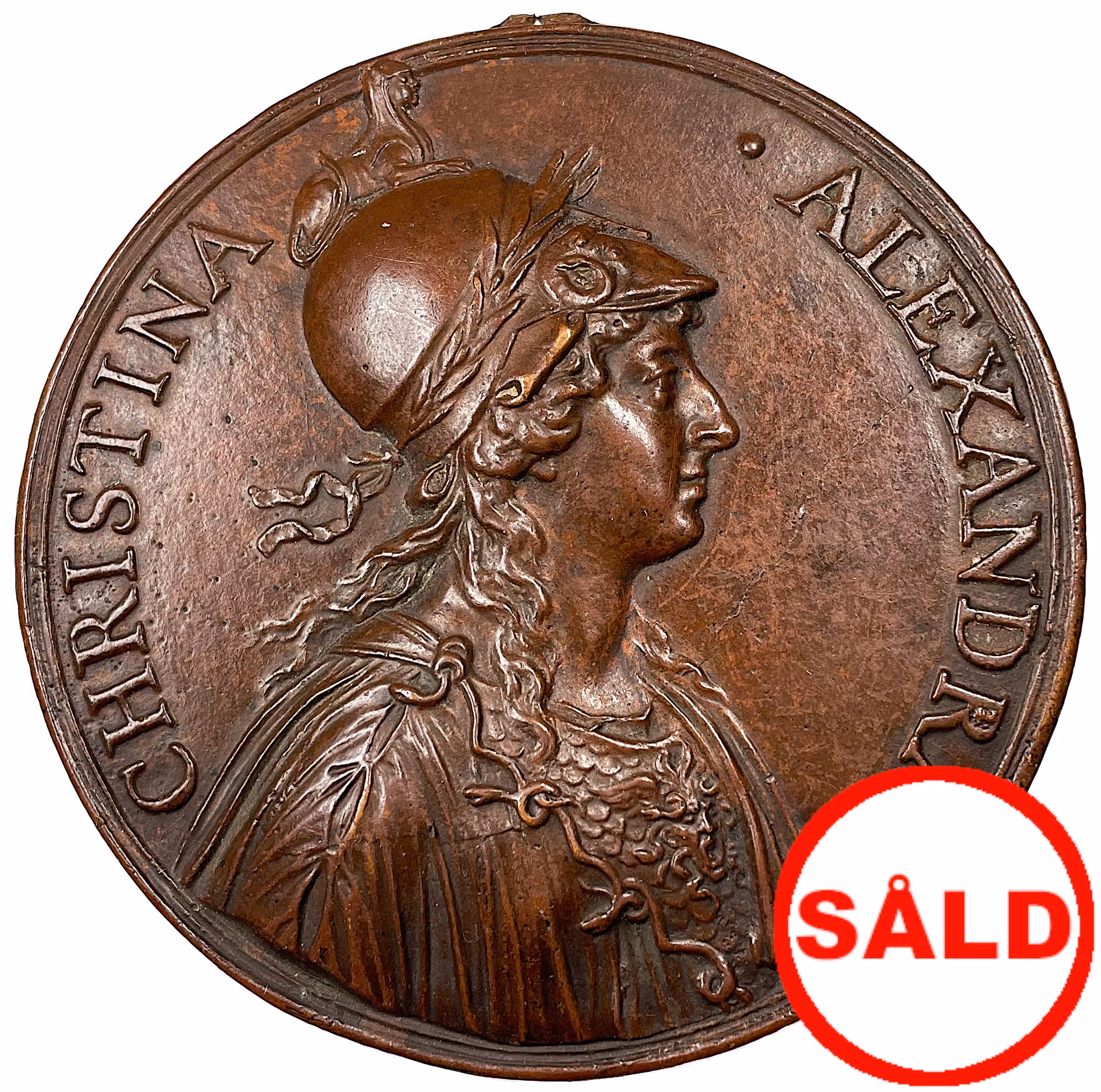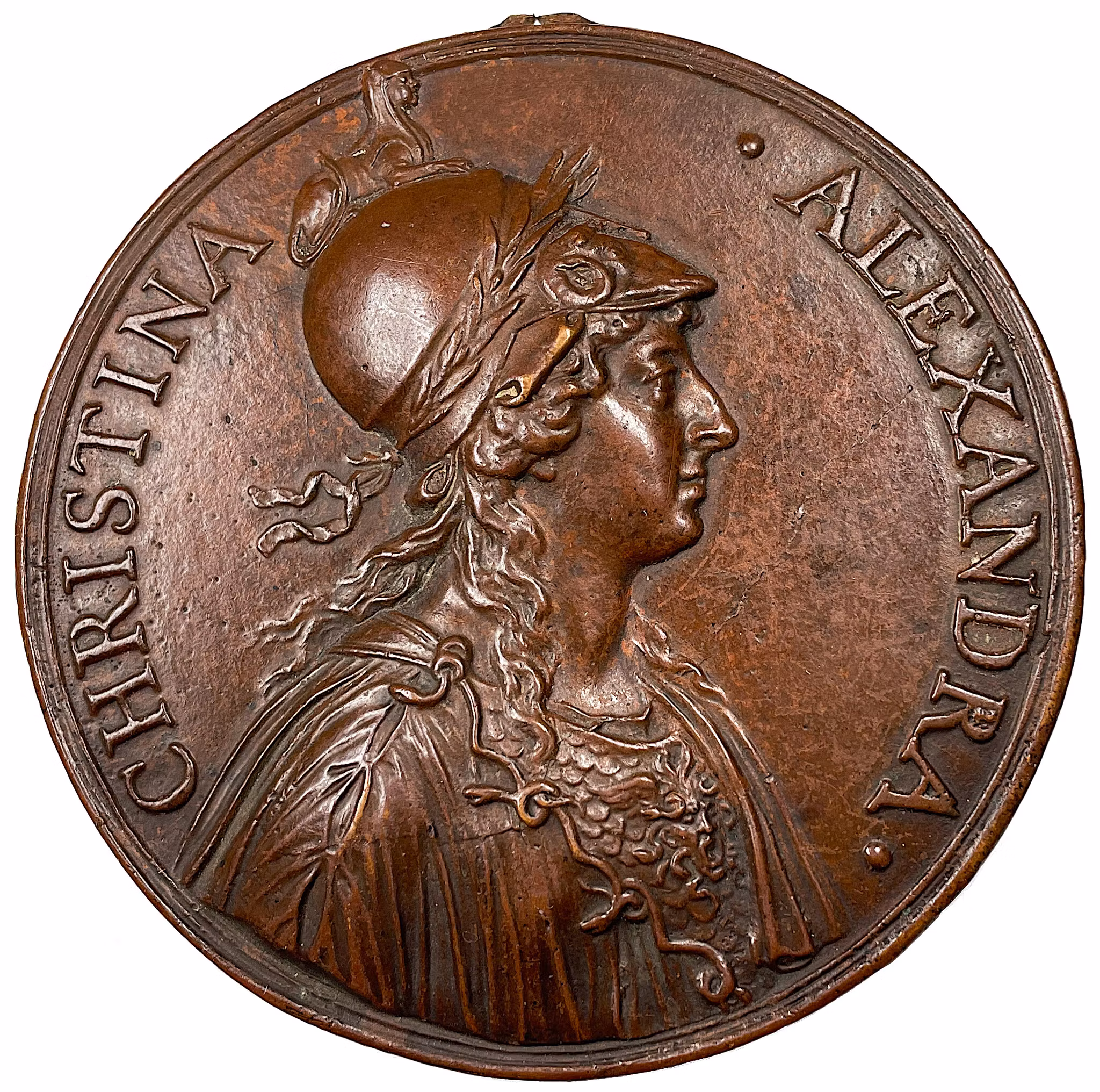 Kristina abdikerade den svenska tronen 1654, konverterade till katolicismen och bosatte sig i Rom där hon omgav sig med ett hov. Kristina var fortfarande en drottning med dess formella priviliegier och jurisdiktion, dock utan land att styra över. Kristina blandade sig i Europeisk politik och hade planer på att överta Neapels kungakrona, men hon var även inblandat som tilltänkt tronföljare till den polska tronen. Den här extremt sällsynta medaljen är modellerad av Gioacchino Francesco Travani och avbildar drottningen som en romersk gudinna bärande antik hjälm prydd av en sfinx. I omskriften kan man läsa Kristinas nya antagna namn: CHRISTINA ALEXANDRA. Hon antog namnet Alexandra när hon bosatte sig i Rom, dels för att hedra påven Alexander VII, dels för att hylla sin hjälte Alexander den store. Medaljen är sannolikt utgiven i samband med hennes flytt till Rom. Brons, ensidig, 93mm, 110.55g, RRR, Kvalitet 1+/01. Hildebrand 127.