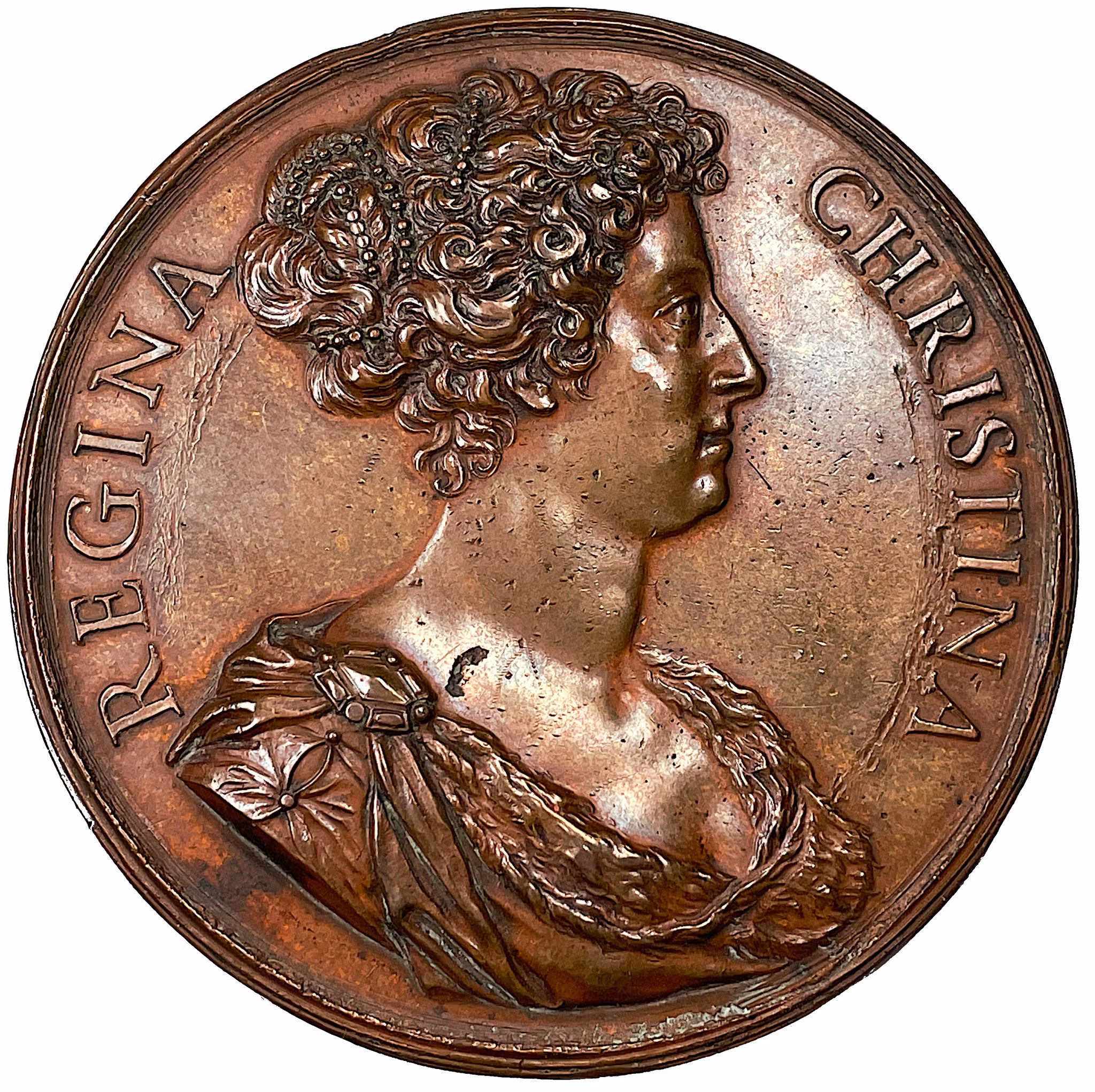 Medaljutgivningen både under hennes tid som regent i Sverige men mer tydligt under hennes tid efter abdikationen avspeglar hur hon uppfattade, eller ville bli uppfattad, av sin samtid - i centrum och av gud utsedd och med outsinliga och obegränsade intellektuella gåvor. Ja hon var faktiskt mycket begåvad och insatt i sin tids alla politiska intriger och maktspel, i vilka hon gärna deltog i med liv och lusta. Ett tilltalande bronsexemplar graverad av Giovanni Battista Guglielmada. . Kvalitet 01, obetydligt plantsfel, Hildebrand 91a, 93.48g, 62mm.