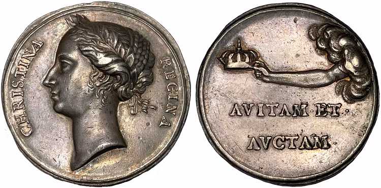 Kristina - Kastpenning till kröningen 1650 av Erich Parise - MYCKET VACKERT EXEMPLAR