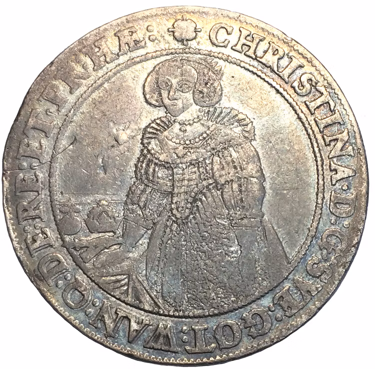 Kristina, Sala, Riksdaler 1640 - Trevligt exemplar Produkten är tyvärr slut i lager. :( Kristina, Sala, Riksdaler 1640 - Trevligt exemplarFin bottenlyster och skarpa detaljer, mindre märken och obetydliga rispor. Silver, 28.40g, 42.86mm, kv. 1+/01