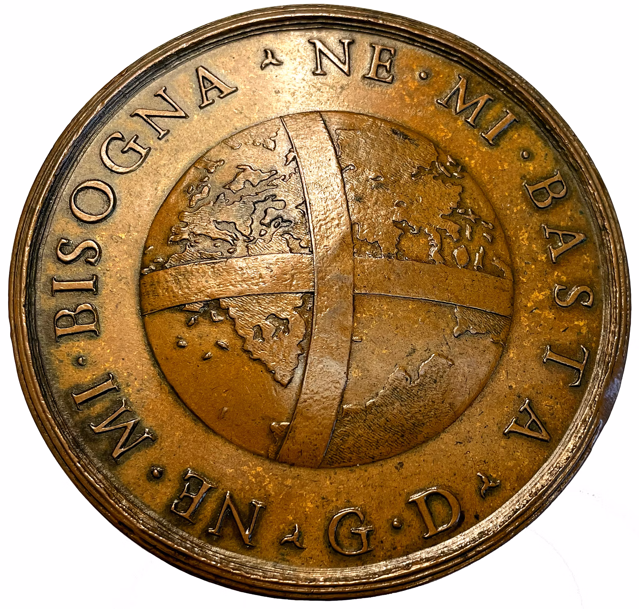 En jordglob omsluten av två korsvis lagda band samt omskriften: "NE MI BISOGNA NE MI BASTA" som översatt betyder: "Den är varken nödvändig eller tillräcklig för mig." Möjligtvis syftande på världen eller den svenska kronan.