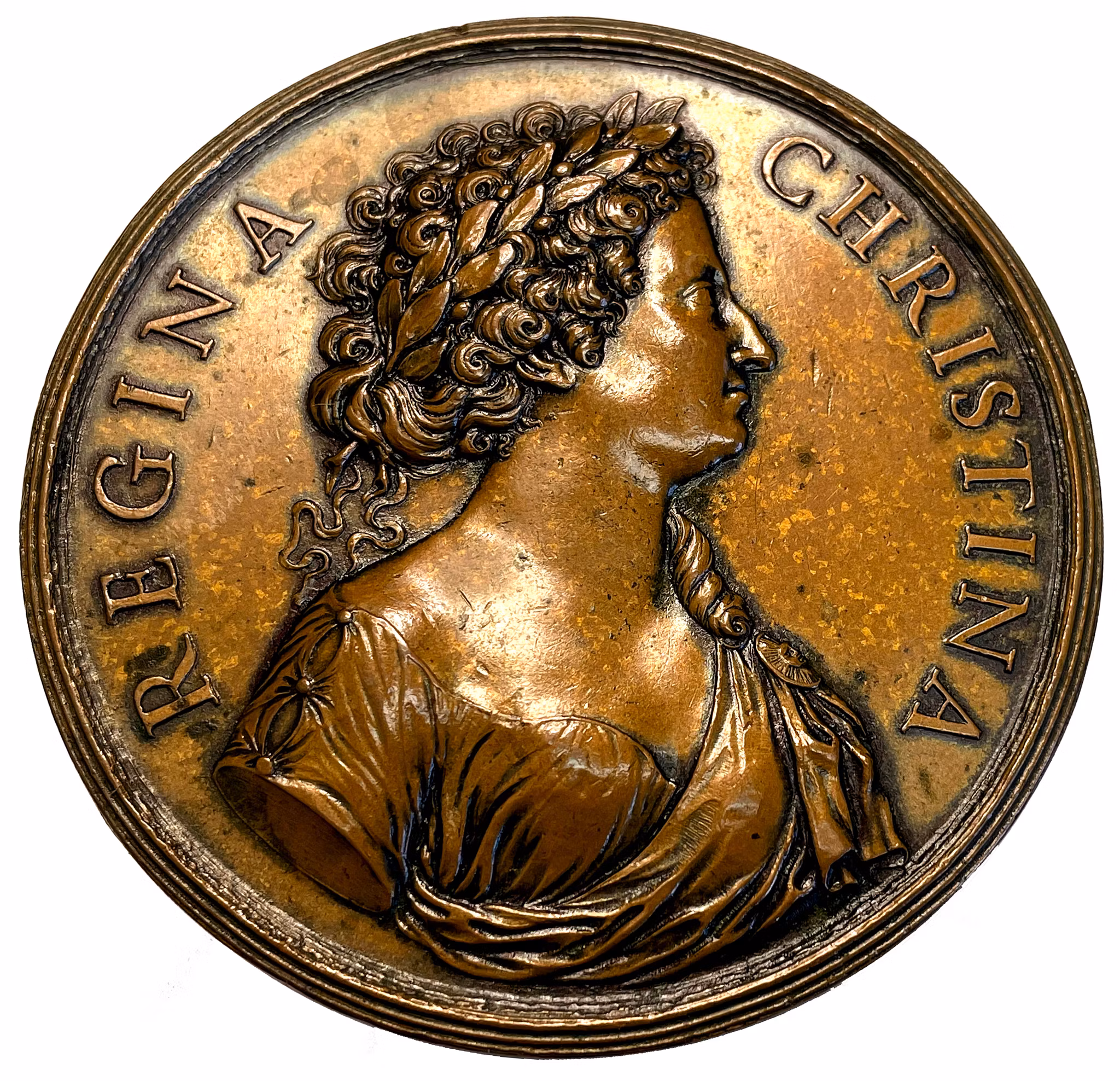 Kristina i Rom ca 1685. En härligt stor och mäktig medalj utgiven i Rom där Kristina var bosatt efter sin abdikation och konvertering till katolicismen fram till sin död 1689. Graverad av Giovanni Battista Guglielmada. Brons. Kvalitet 1+/01, 86.84g, 62mm. Hildebrand 113b.