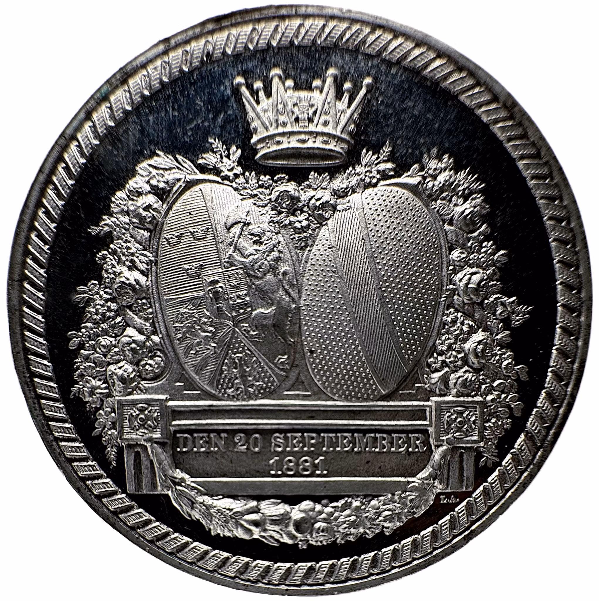 Två sköldar med respektive släktvapen (till vänster Sveriges stora riksvapen, till höger Badens) omges av blomstergirlanger och prydnader. Ovan sköldarna en krona. Under sköldarna står i en kartusch datumet för giftermålet: "DEN 20 SEPTEMBER 1881".