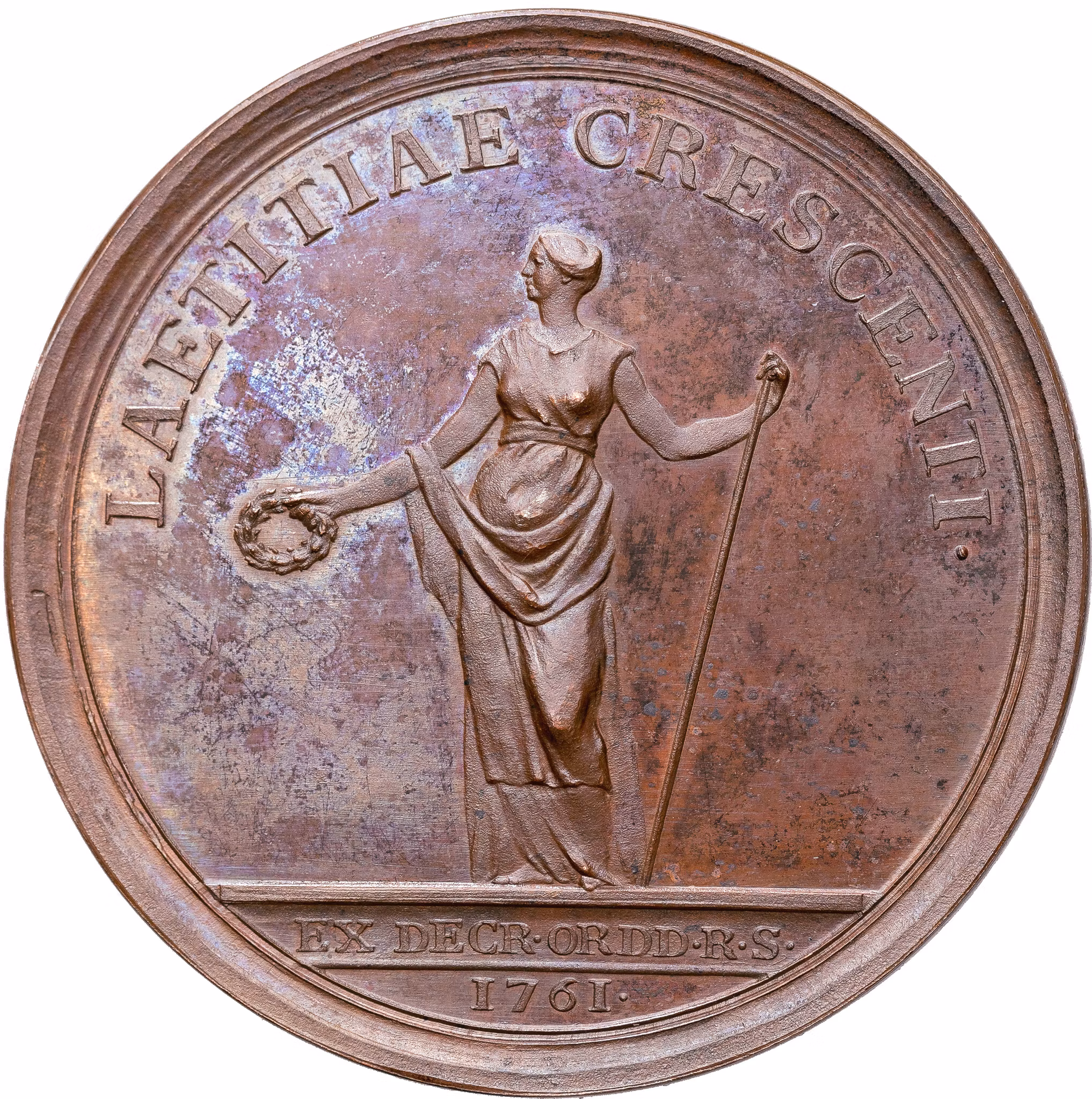 Glädjen stående med lagerkrans i handen samt omskriften: "LAETITIAE CRESCENTI•". I avskärningen längst ner: "EX DECR•ORDD •R•R•/ 1761".