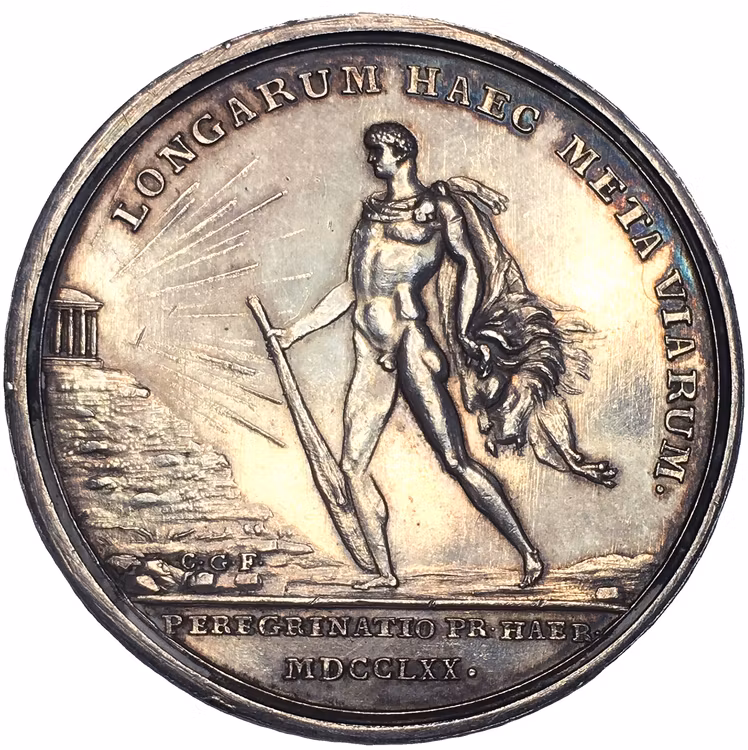 Kronprinsen, under antaget namn Greve av Gotland, och hans broder Fredrik Adolf, som kallade sig greve av Öland, företog i sällskap med riksrådet greve Carl Fredrik Scheffer en liten utrikes resa. Resan startade den 8 november 1770 och de besökte hoven i Köpenhamn, Braunschweig och Zweibrücken, för att ankomma den 4 februari 1771 till den den franske konungen Ludvig XV:s hov. Resan avbröts dock hastigt då kronprins Gustav mottogas av beskedet om sin faders död, konung Adolf Fredrik. En vacker medalj med ett kraftfullt porträtt av kronprinsen på åtsidan, på frånsidan avbildas Herkules med klubba. Medaljen graverad av C. G. Fehrman 1783. Silver, 39.06g, 42.35mm, kvalitet 1+/01. Hildebrand 2:145:10.