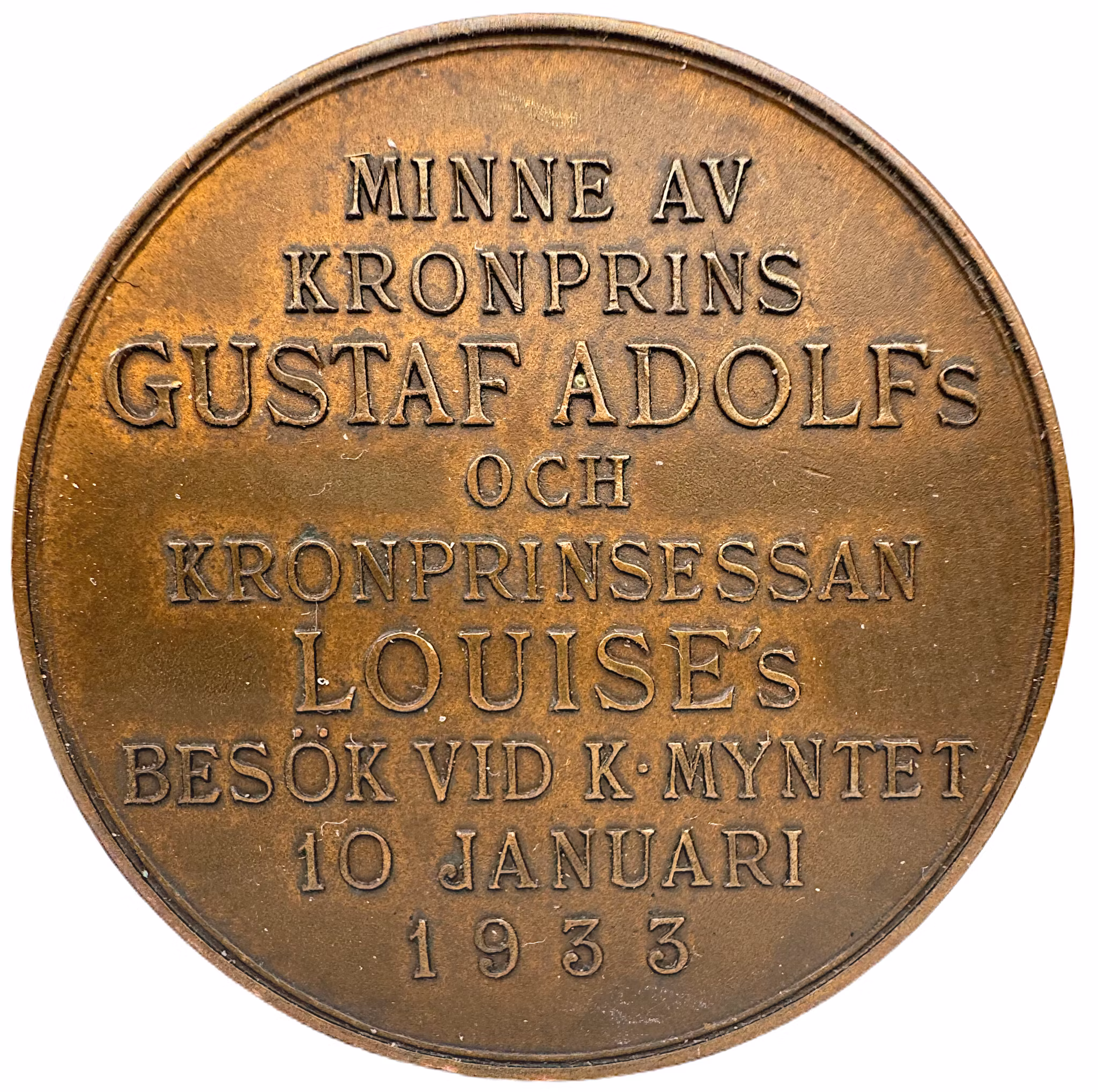 Text på nio rader: "MINNE AV | KRONPRINS | GUSTAF ADOLFS | OCH | KRONPRINSESSAN | LOUISE's BESÖK VID K. MYNTET | 10 JANUARI | 1933".