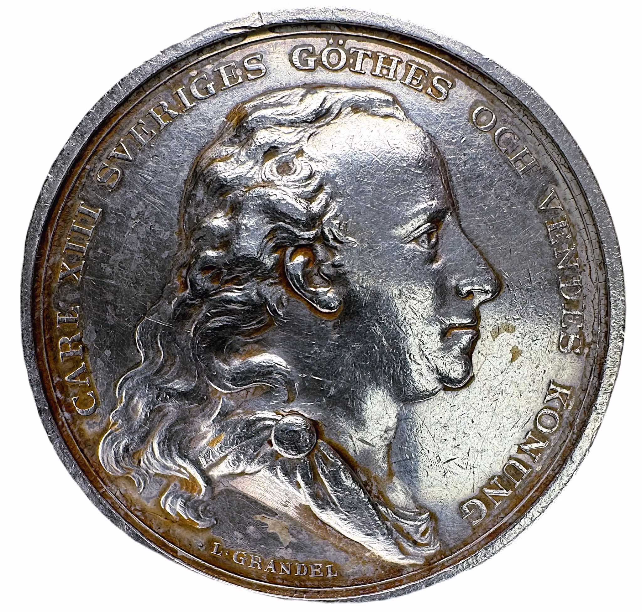 Konungens högervända bild med långt utsläppt hår, , nedtill gravörens namn "L•GRANDEL". I omskriften: "CARL XIII SVERIGES GÖTHES OCH VENDES KONUNG"