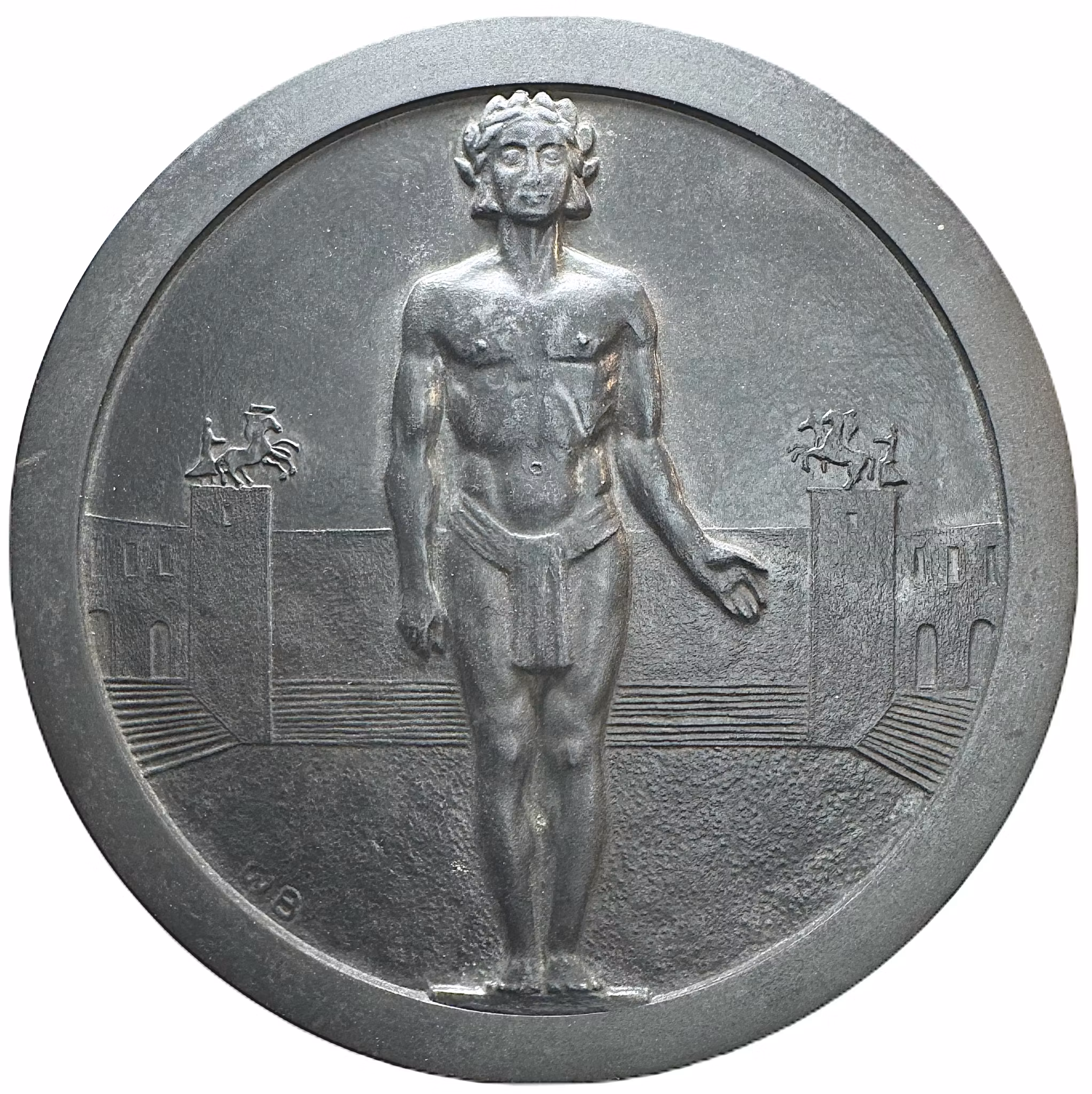 En vägghängd ensidig minnesmedalj, 15,5 cm i diameter, gjuten i järn med vackert patinerad ytfinish. Medaljen domineras av ett klassiskt olympiskt/idrottsligt motiv: en stående, lagerkrönt atlet endast iklädd ett höftskynke som en eftergift till den moderna tiden. I det antika Grekland, som utgjorde förebilden för de moderna olympiska spelen, vilka inleddes i Aten 1896, användes både arkitektur och motivval för de medaljer som framställdes i samband med Stockholms stadiums invigning. Under antiken tävlade deltagarna helt nakna, endast inoljade i olivolja. Sommarolympiaden i Aten 1896 var den första i modern tid, organiserad av den Internationella Olympiska Kommittén (IOK) under ledning av Pierre de Coubertin. Spelen hölls som en återupplivning av de antika olympiska spelen och markerade början på de olympiska spelens moderna era. I medaljens bakgrund syns ett stadium med två torn, vardera prydda med ett fyrspann av stegrande hästar. Vid vänstra kanten finns konstnärens initialer, W. B. Kvalitet 01, 390 g, 155 mm. Mycket sällsynt. Stockholms stadion invigdes officiellt den 1 juni 1912. De olympiska spelen i Stockholm, även kända som sommar-OS 1912, pågick sedan från den 6 juli till den 22 juli 1912. Möjligen modellerad av Wilhelm Napoleon Berglund (1886–1960) som var en svensk bildkonstnär och konsthantverkare verksam vid denna tid.