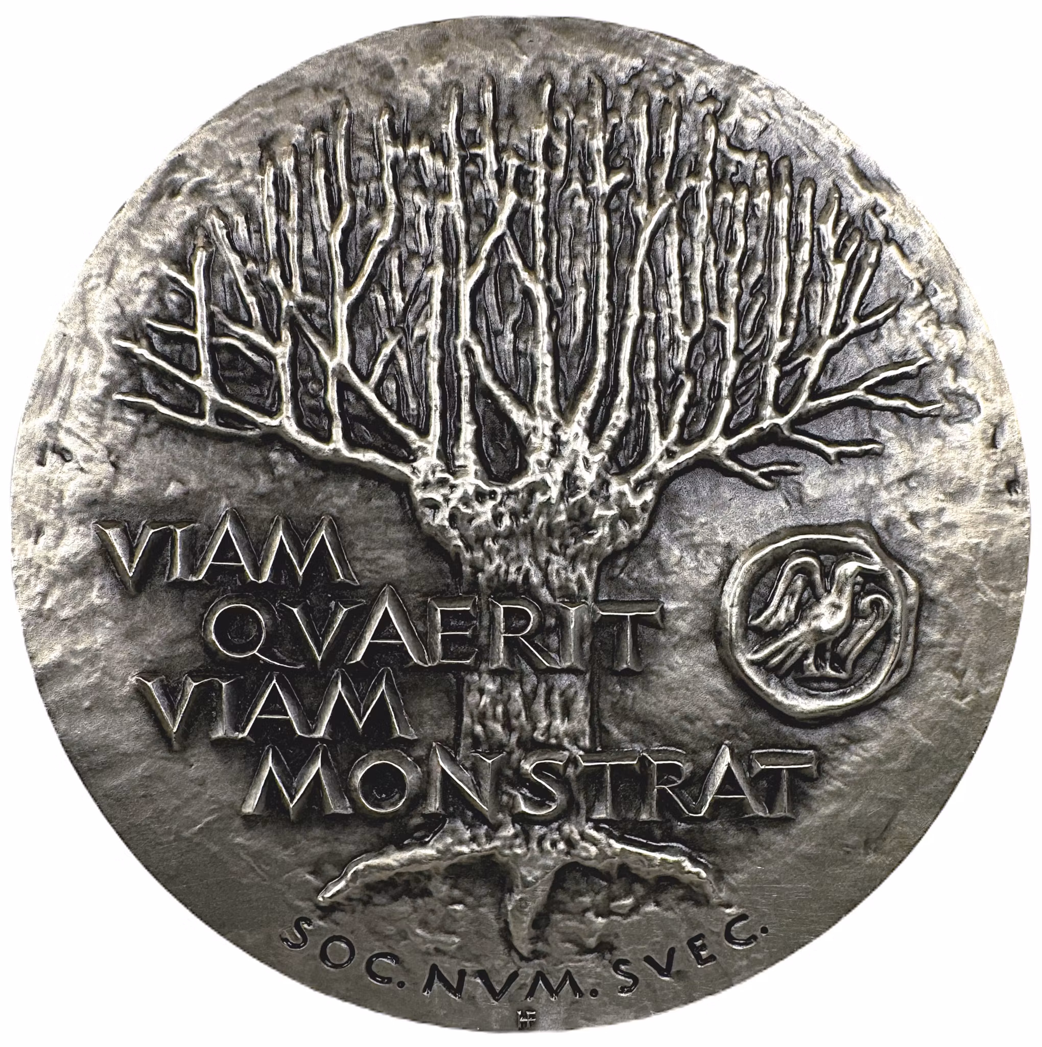 Livets träd med den latinska texten på fyra rader delvis placerat över trädets stam: "VIAM / QVAERIT / VIAM / MONSTRAT", som översatt kan tolkas som: "Vägen söker, vägen visar". Till höger i fältet en avbildning av en brakteat från Erik Eriksson (1234-1250) och under trädets rötter: SOC. NVM. SVEC. (Svenska Numismatiska Föreningen).
