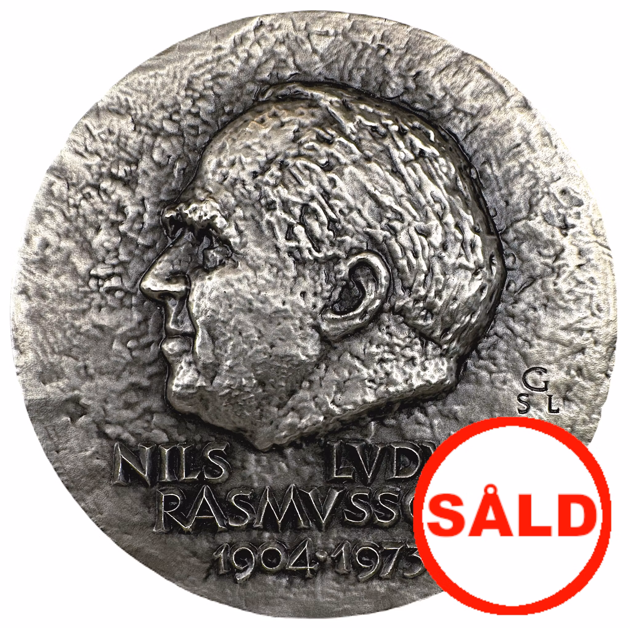 Nils Ludvig Rasmusson (1904-1973) - Förste antikvarie, numismatiker, chef för Kungl. Myntkabinettet, SNF:s ordförande 1947-53 och 1962-73. Av Gunvor Svensson Lundkvist 1974 efter en av henne 1962 modellerad, större och gjuten medalj. Präglad 1975 av Huguenin Médailleurs S.A., Le Locle (Schweiz), där stamparna förvaras. Utgiven i samarbete med konstnären för att hedra Rasmussons minne; vinsten avsatt till en stipendiefond i dennes namn. Silver, 925/1000, 79.65g, 56 mm. SNF 53. Kvalitet 01, präglad i en numrerad upplaga av 150 exemplar. Detta exemplar är nummer 140. Medaljen präglades även i guld 18 karat, 127 g i en upplaga om 5 numrerade exemplar och brons 250 exemplar. Se vidare i NNUM 1974:10, s 268 f.