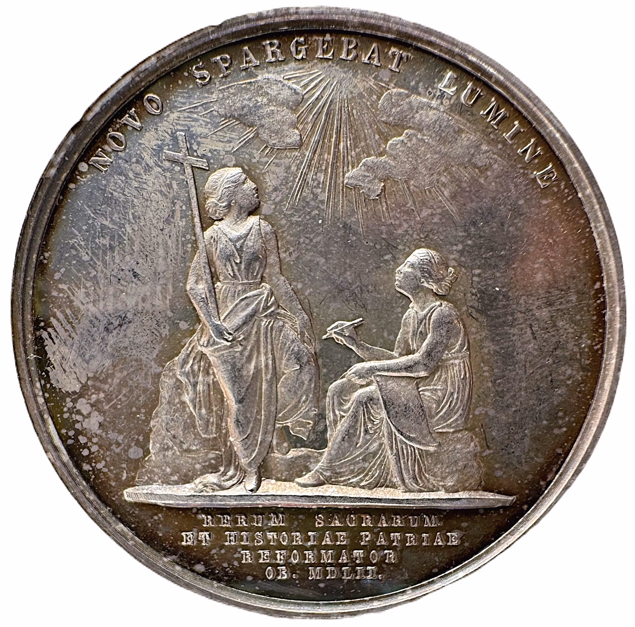 Två kvinnor i antika kläder sitter sida vid sida – den ena symboliserar Religionen och håller ett kors vilande mot axeln, den andra föreställer Historien med en skrivpenna i handen och ett utrullat pergament i knäet. Båda vänder blicken mot solen, vars strålar tränger genom molnen. I omskriften: "NOVO SPARGEBAT LUMINE" och i avskärningen påfyra rader: "RERUM SACRARUM ET HISTORIAE PATRIAE REFORMATOR OB. MDLII". Denn latinska texten kan översättas till: "Han spred ett nytt ljus" och "Reformator av de heliga tingen och fosterlandets historia, död 1552".
