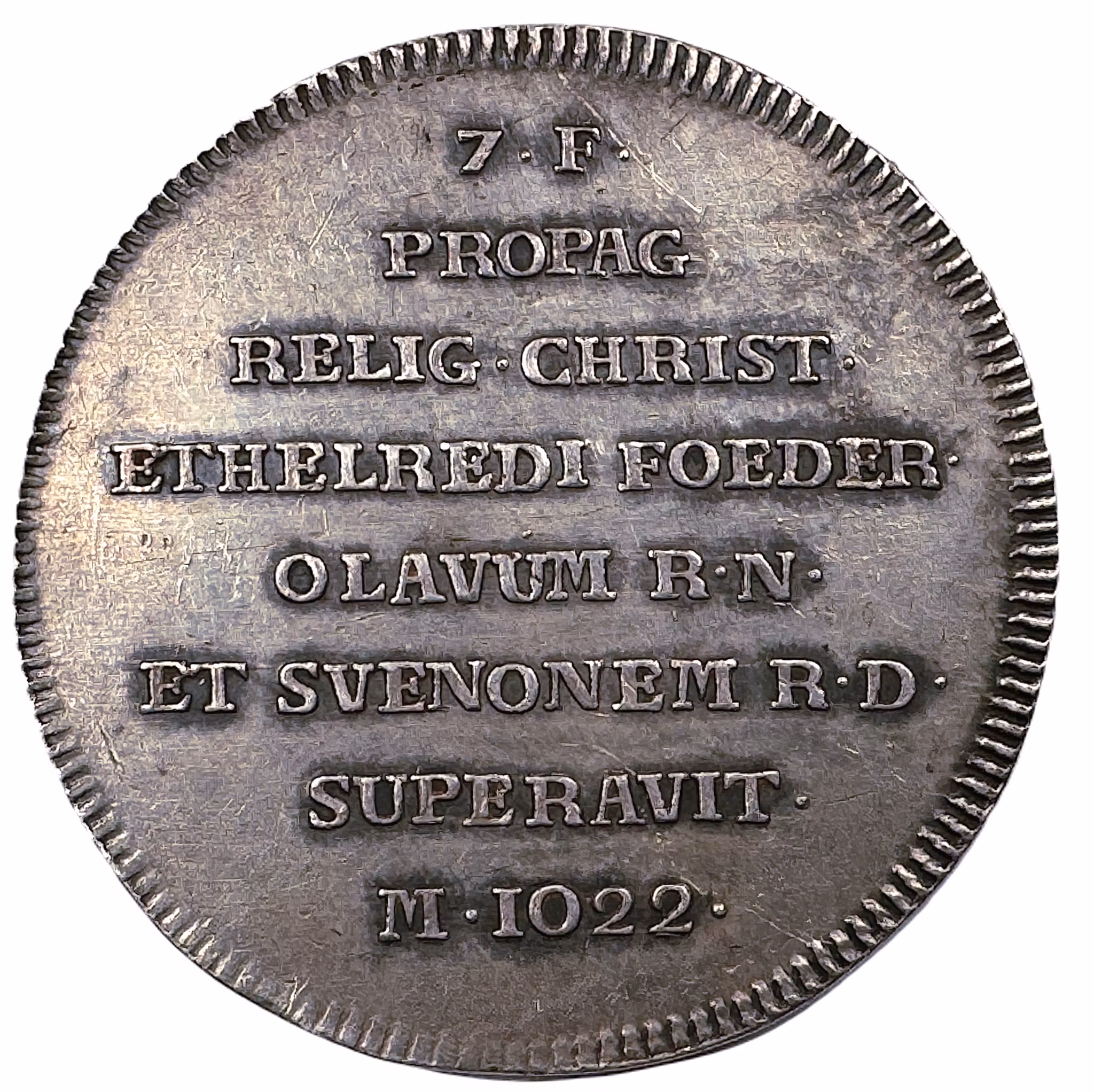 Text på sju rader, överst ordningsnumret i serien: "7•F• / PROPAG / RELIG•CHRIST• / ETHELREDI FOEDER• / OLAVUM R•N• / ET SVENONEM R•D• / SUPERAVIT• / M• 1022•"