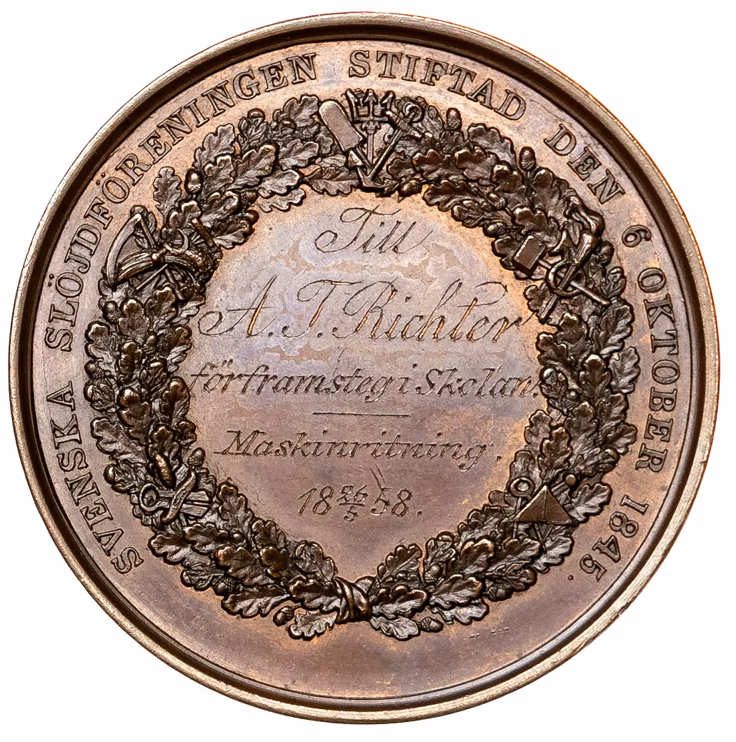 Att detta exemplar tilldelades A. T. Richter år 1858 för "framsteg i Maskinritning" placerar medaljen i hjärtat av den industriella revolutionen i Sverige. Medan klotsritning lärde ut form och perspektiv genom naturens former, representerade maskinritningen den strikta geometriska precision som krävdes för konstruktion av ångmaskiner, lokomotiv och fabriksutrustning. Under 1850-talet genomgick Slöjdföreningen också en social expansion; det var vid denna tid, efter påtryckningar från Baltzar Cronstrand, som man började acceptera kvinnliga elever, vilket markerade början på en mer inkluderande utbildningsväg.