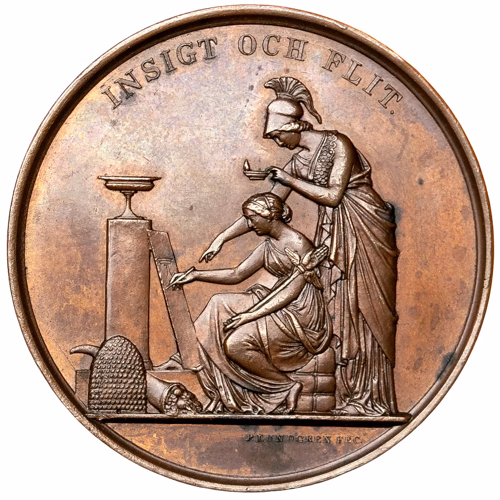 Minerva stående, med en lågande lampa i handen, lutar sig över en sittande kvinna (Industrin) och pekar på en teckning. Den sittande kvinnan håller i en stav med en bevingad hand med ett öga i mitten. Vid sidan återfinns en bikupa och ett nedvänt ymnighetshorn. I avskärningen står gravörens namn: "P. LUNDGREN FEC.", vilket utläses Pehr Henrik Lundgren fecit och betyder "Pehr Henrik Lundgren gjorde [den]". Överst i fältet löper texten: "INSIGT OCH FLIT".