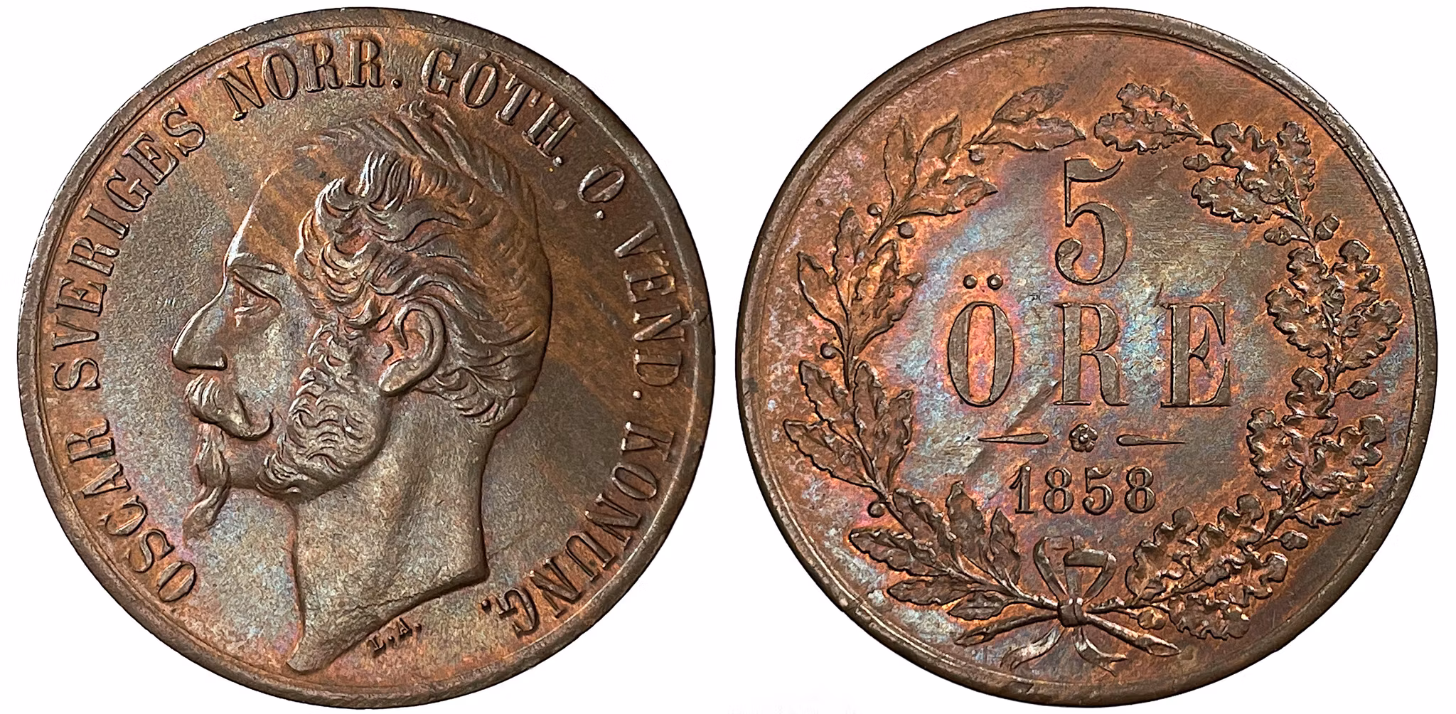 Oskar I, 5 Öre 1858 på 7 - Ett vackert ocirkulerat exemplar Produkten är tyvärr slut i lager. :( Oskar I, 5 Öre 1858 på 7 - Ett vackert ocirkulerat exemplarKvalitet 01/0, SMB 143