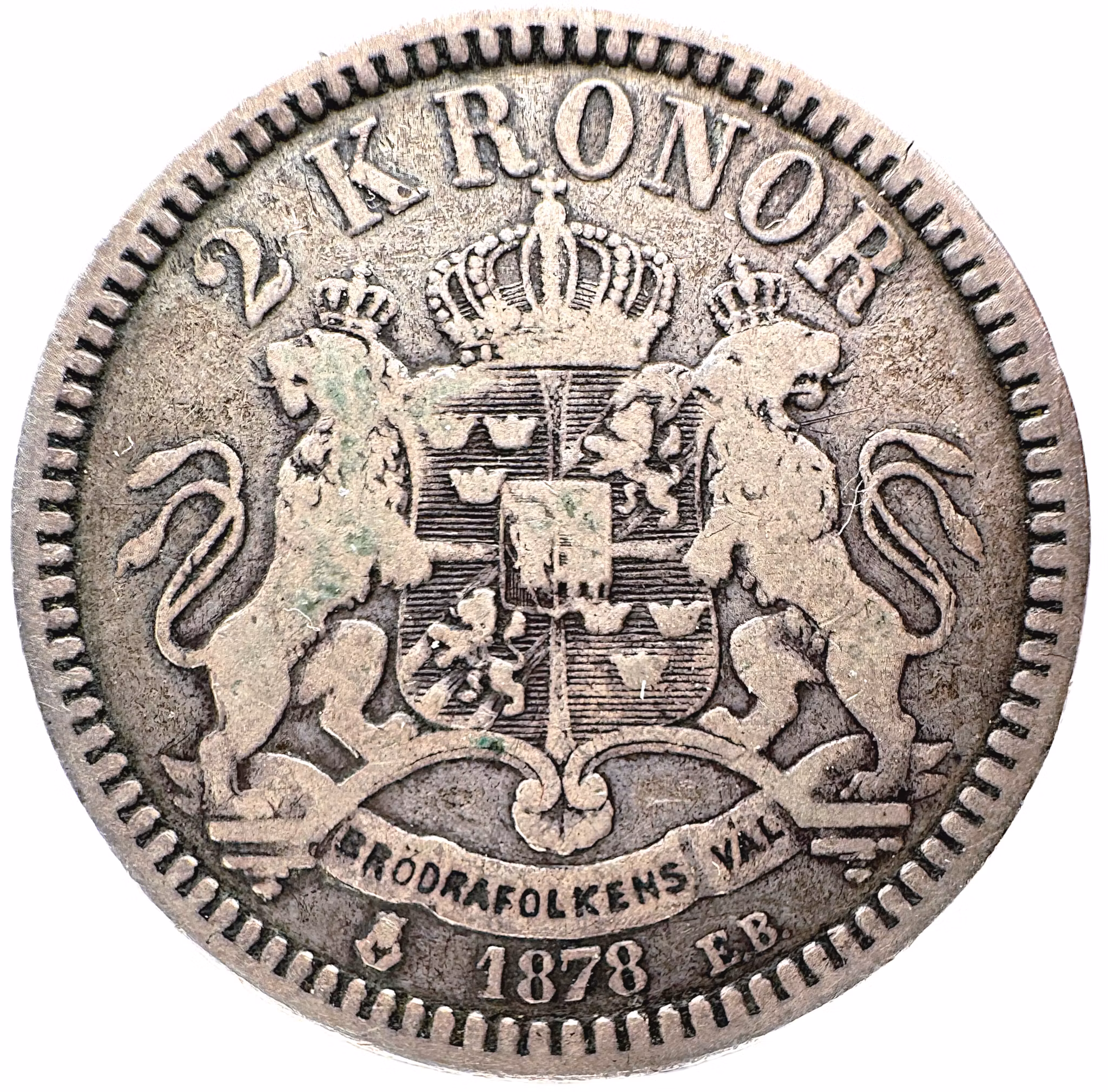 Sveriges stora riksvapen flankerat av två stående krönta lejon. Under skölden på ett veckat band, konungens valspråk: "BRÖDRAFOLKENS VÄL", syftande på unionen med Norge.. Överst valören: "2 KRONOR" och nederst årtalet 1878. På var sida om årtalet, St Eriks vapensköld (Stockholms stadsvapen) och myntmästaren Emil Brusewitz initialer: "EB". Brusewitz var verksam vid myntverket åren 1876-1908.