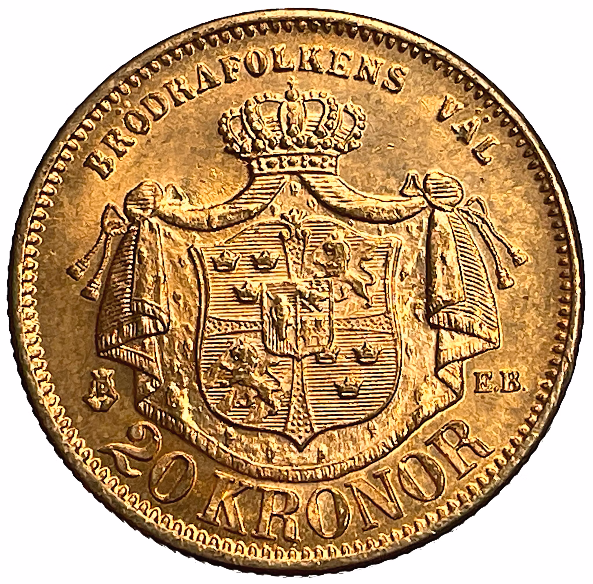 Oskar II - 20 Kronor 1876 Produkten är tyvärr slut i lager. :( Oskar II - 20 Kronor 1876SG 6, med hjärtvapen, åtsidan med mindre hanteringsmärken, 8.96g, 23mm, kvalitet 01
