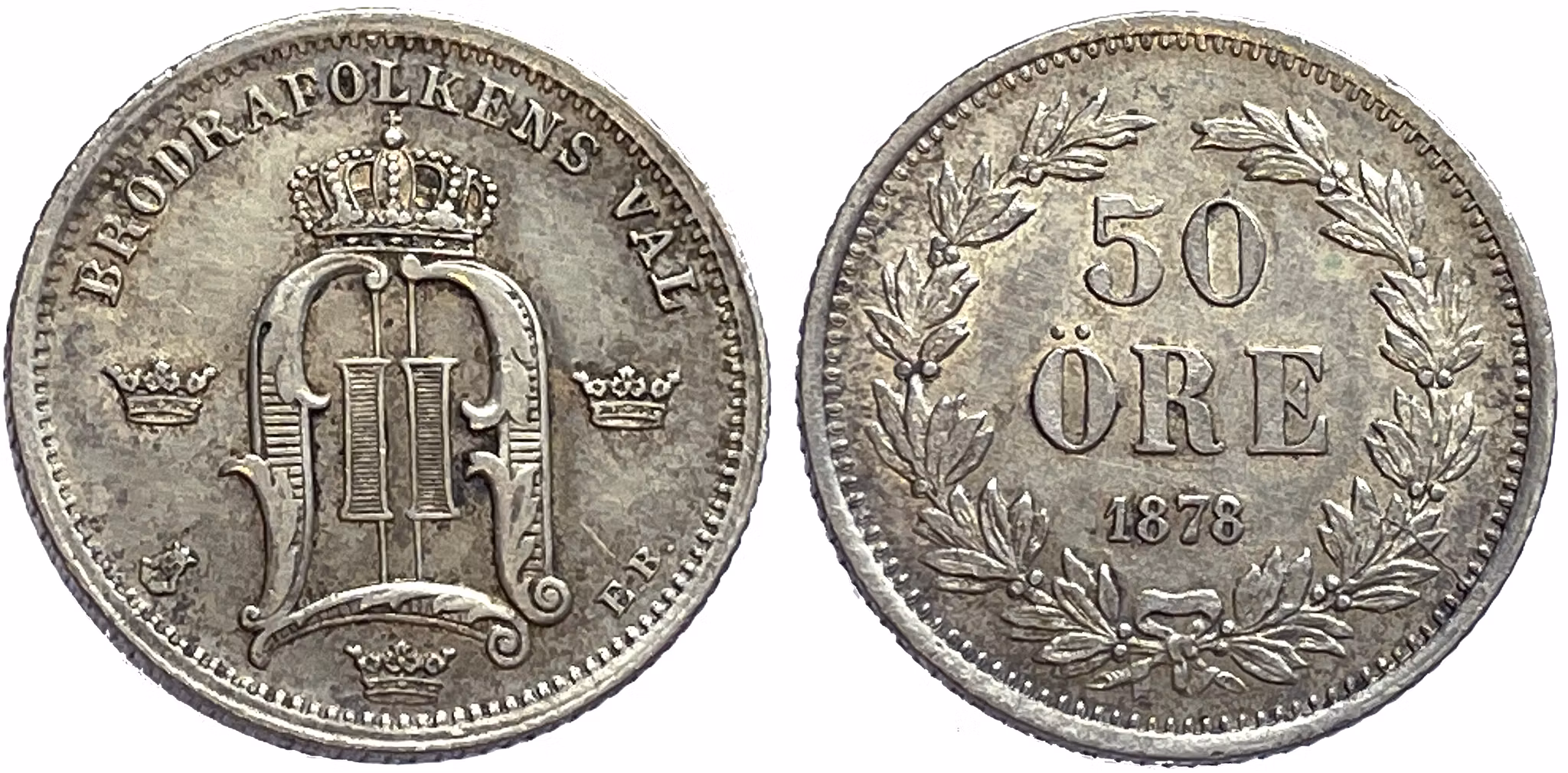 Oskar II - 50 Öre 1878 Produkten är tyvärr slut i lager. :( Oskar II - 50 Öre 1878Kvalitet 1+, SMB 64