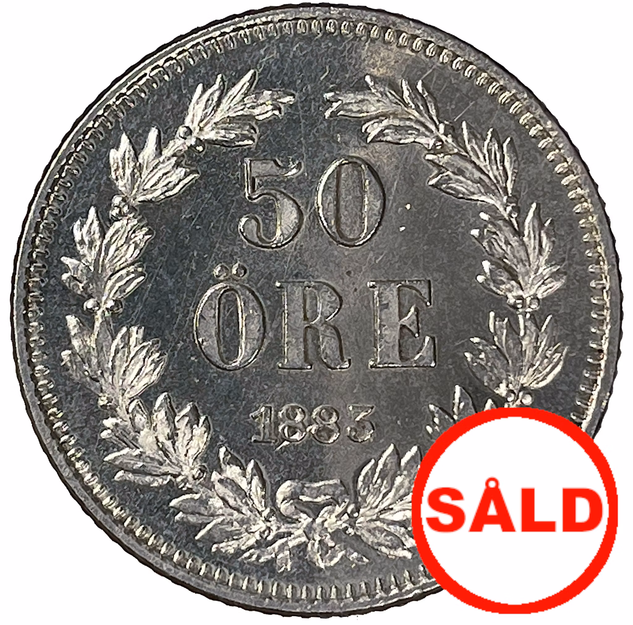 Oskar II, 50 Öre 1883 - Vackert exemplar med frostaktig relief och djupt glänsande fält Produkten är tyvärr slut i lager. :( Oskar II, 50 Öre 1883 - Vackert exemplar med frostaktig relief och djupt glänsande fältKvalitet 01/0, SMB 68