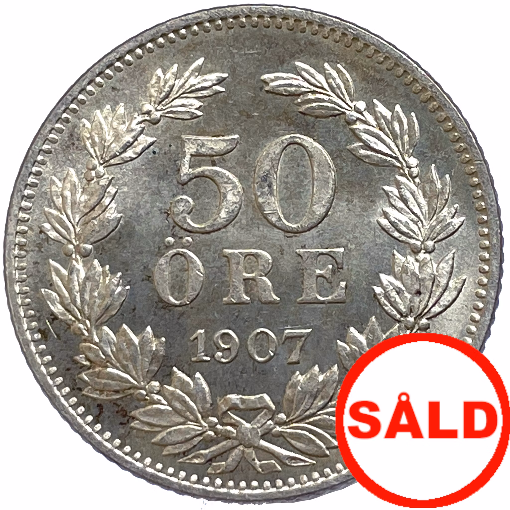 Oskar II - 50 Öre 1907 - Ett vackert ocirkulerat exemplar Produkten är tyvärr slut i lager. :( Oskar II - 50 Öre 1907 - Ett vackert ocirkulerat exemplarKvalitet 01/0, SMB 73