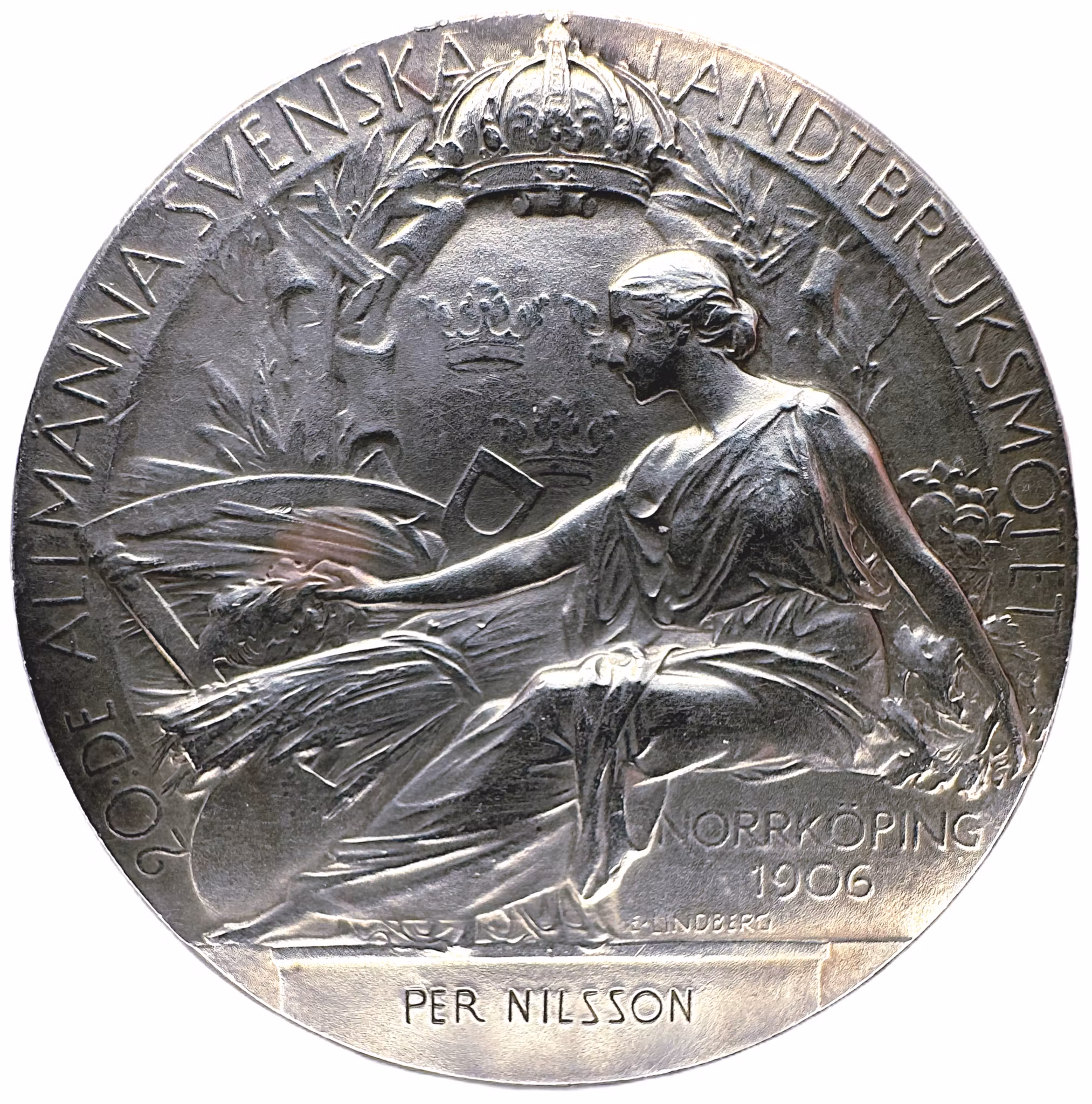 En kvinna i antik dräkt, symboliserande odling och jordbruk, sitter i centrum på medaljen. Hon håller en krans i högra handen, vilande ovanför en sädeskärve, medan en lie och en spade placeras bredvid henne som jordbruksattribut. Bakom henne reser sig ett stiliserat ymnighetshorn fyllt med symboler för rikedom, och i bakgrunden syns en kransomgiven sköld med Sveriges tre kronor, krönt av en kunglig krona. Omskriften lyder "20:E ALLMÄNNA SVENSKA LANDTBRUKSMÖTET". På en tavla under kvinnan står "NORRKÖPING 1906" i två rader, och i avskärningen anges namnet på den belönade: "PER NILSSON".