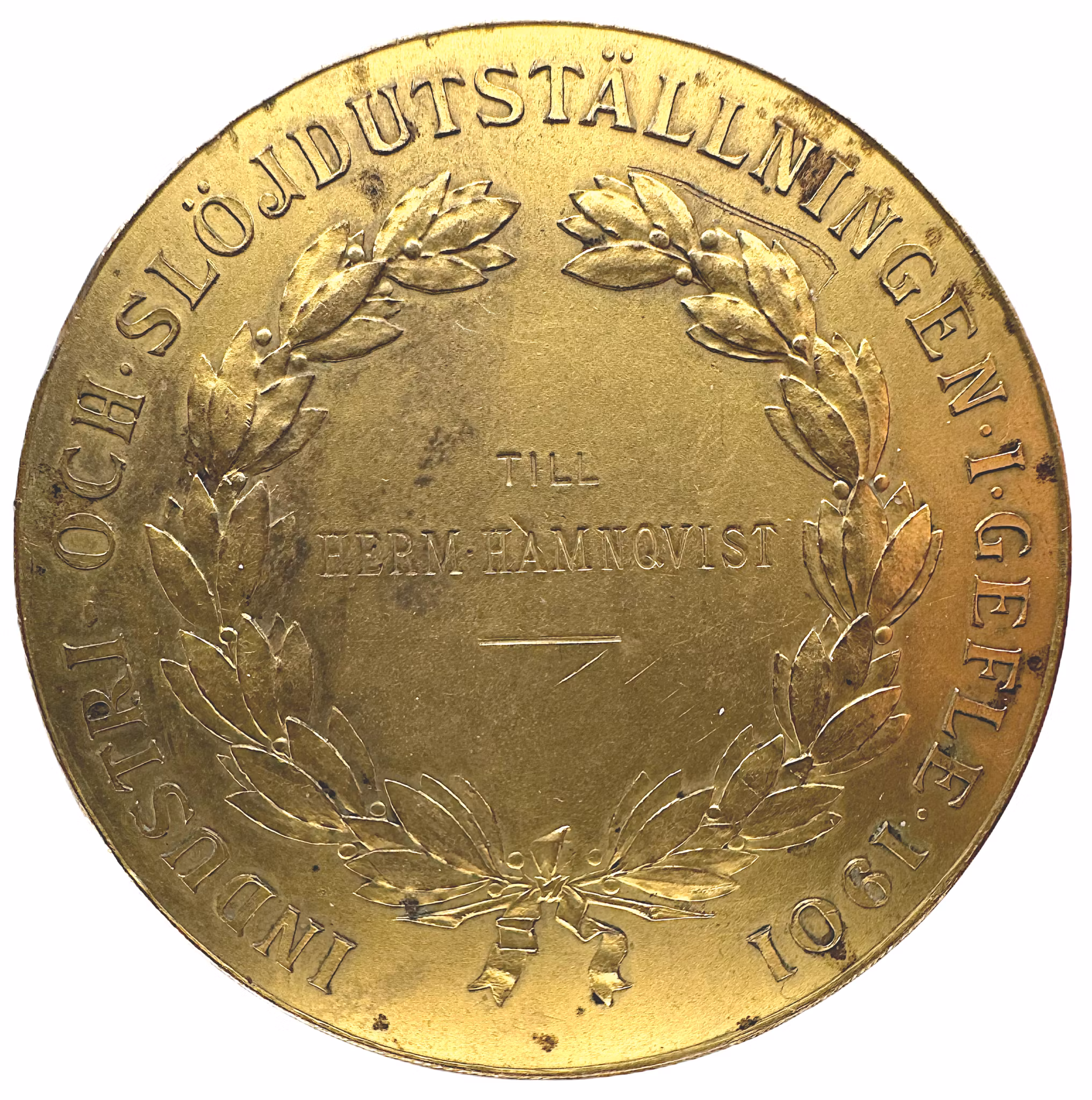 I omskriften: "INDUSTRI OCH SLÖJDUTSTÄLLNINGEN I GEFLE 1901" och innanför denna en lagerkrans. I centrum belöningsmedaljens mottagares namn: "TILL HERM. HAMNQVIST"