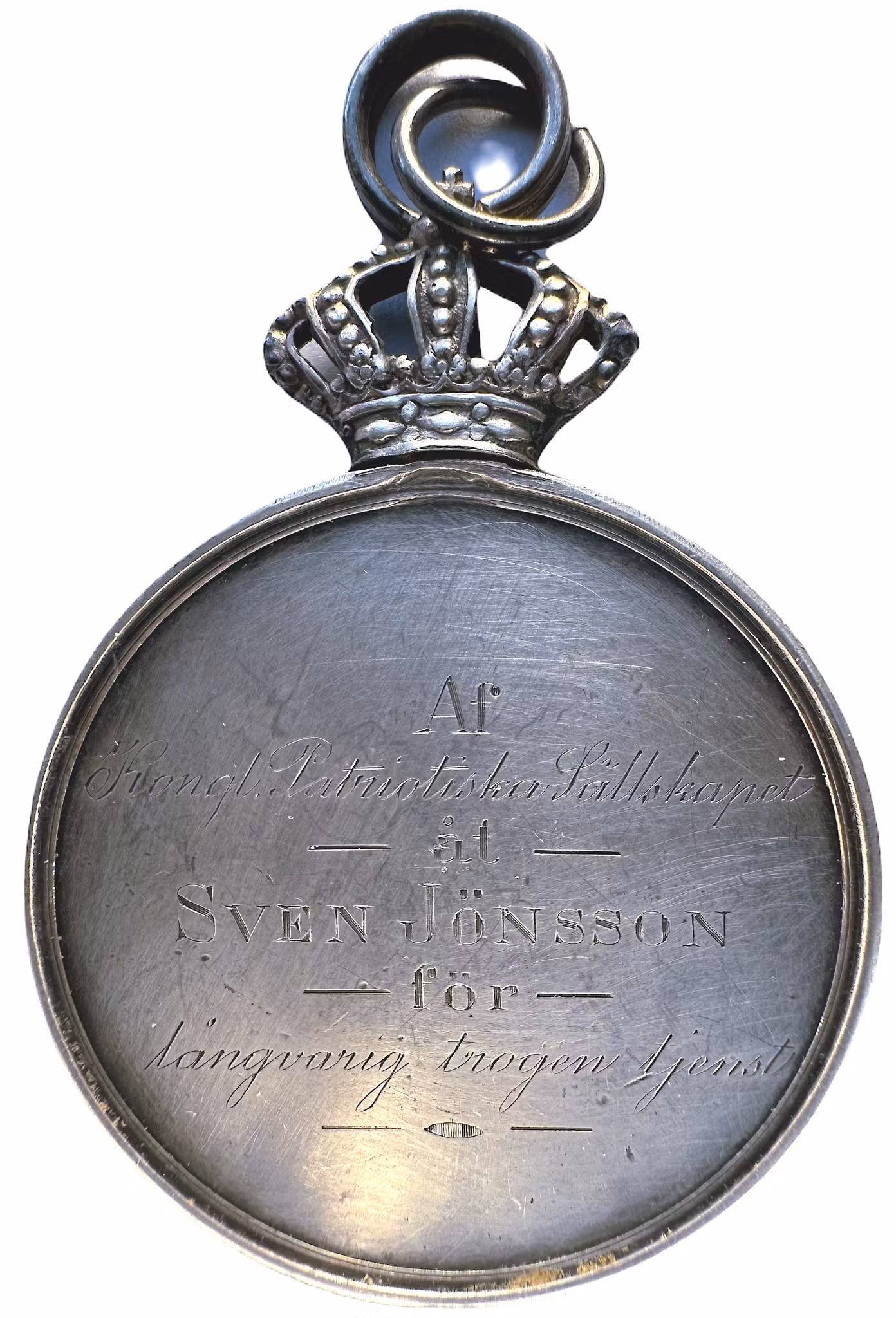 Utdelad till Sven Jönsson för "långvarig trogen tjenst". Kvalitet 1+, gniden, silver 41.84g, 42mm