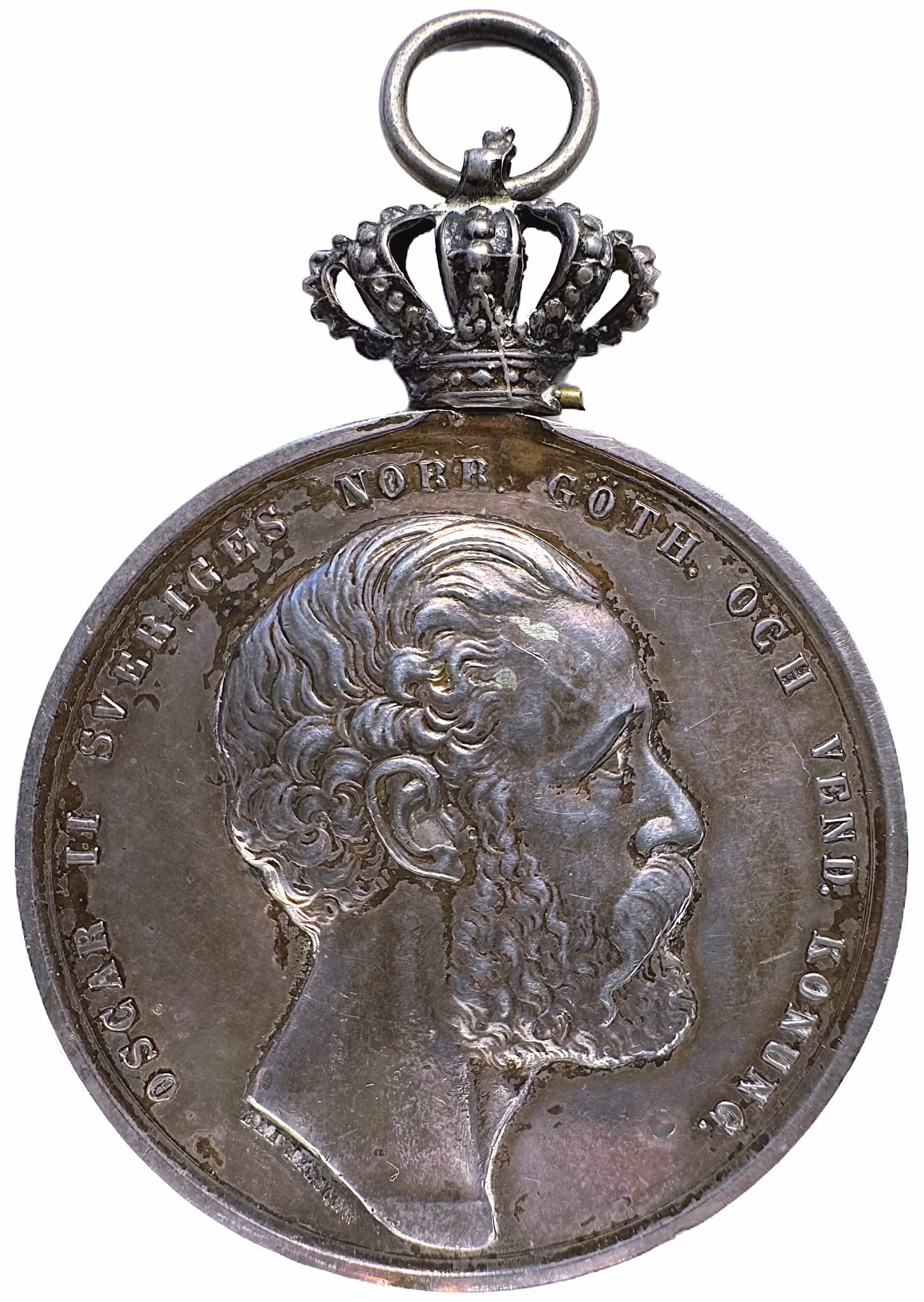 Oskar II - Kungliga Patriotiska Sällskapet modell 1872, liten krona med gångjärnsfäste, av Lea Ahlborn - tilldelad Erik Larsson 1877 - Sällsynt