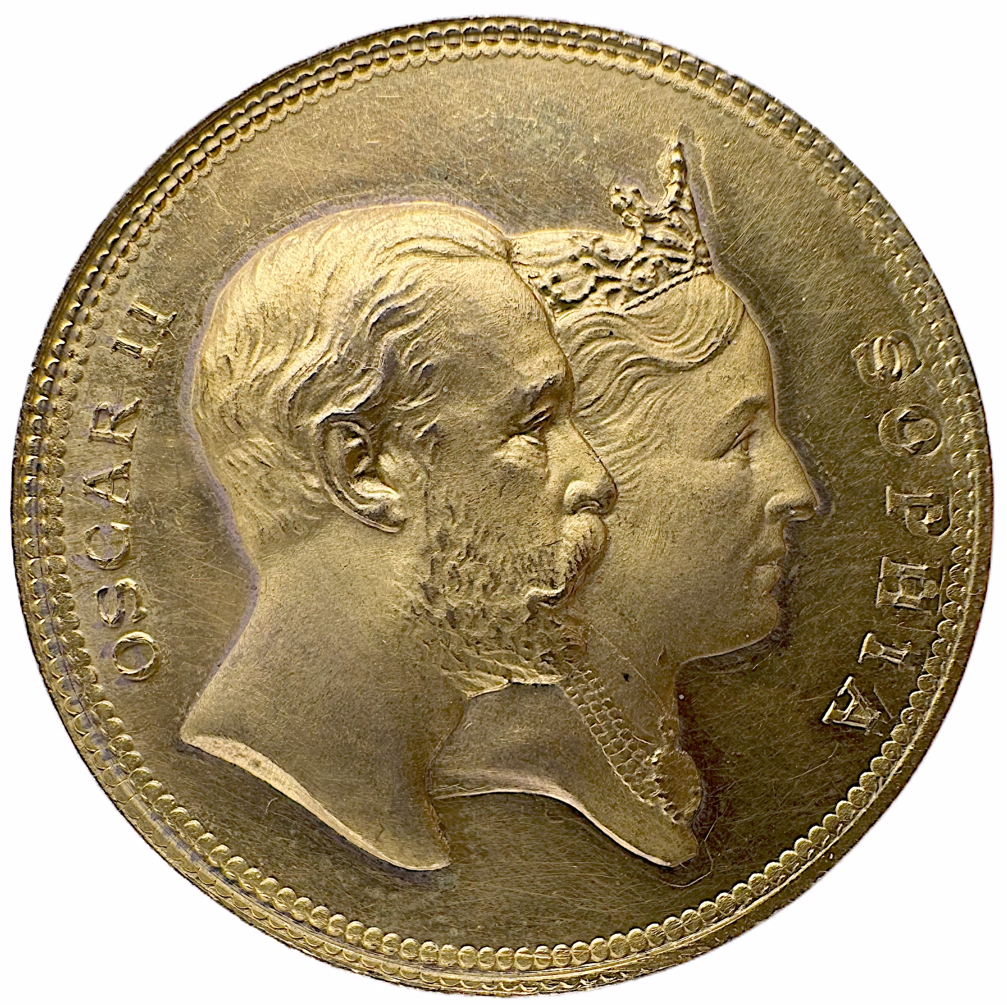 Åtsidan visar högervända bröstbilder av konung Oskar II och drottning Sophia, placerade i profil över varandra. Konungen avbildas med ett detaljerat skulpterat skägg, och drottningen bär en liten krona i sitt uppsatta hår. Längs den vänstra kanten löper texten "OSCAR II" och längs den högra "SOPHIA". Medaljens ytterkant är inramad av en dekorativ, pärlstavsliknande bård.