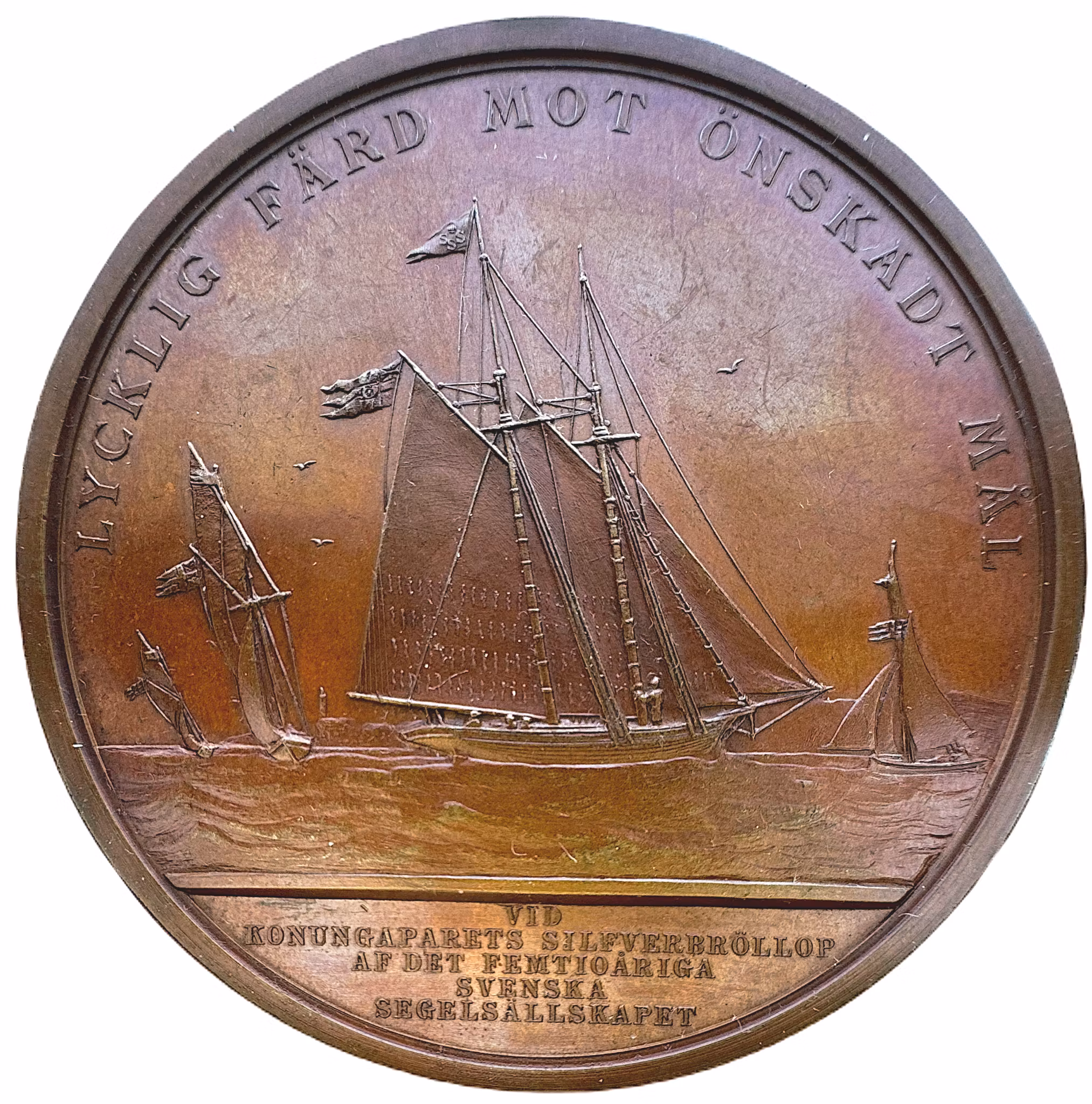 En regatta i Stockholms skärgård, utförd av några Svenska Segelsällskapets båtar, med chefsfartyget, skonerten Vanadis, seglande i förgrunden; på avstånd syns land med Landsorts fyrtorn. I omskriften: "LYCKLIG FÄRD MOT ÖNSKADT MÅL". I avskärningen text på fem rader: "VID / KONUNGAPARETS SILFVERBRÖLLOP / AF DET FEMTIOÅRIGA / SVENSKA / SEGELSÄLLSKAPET"