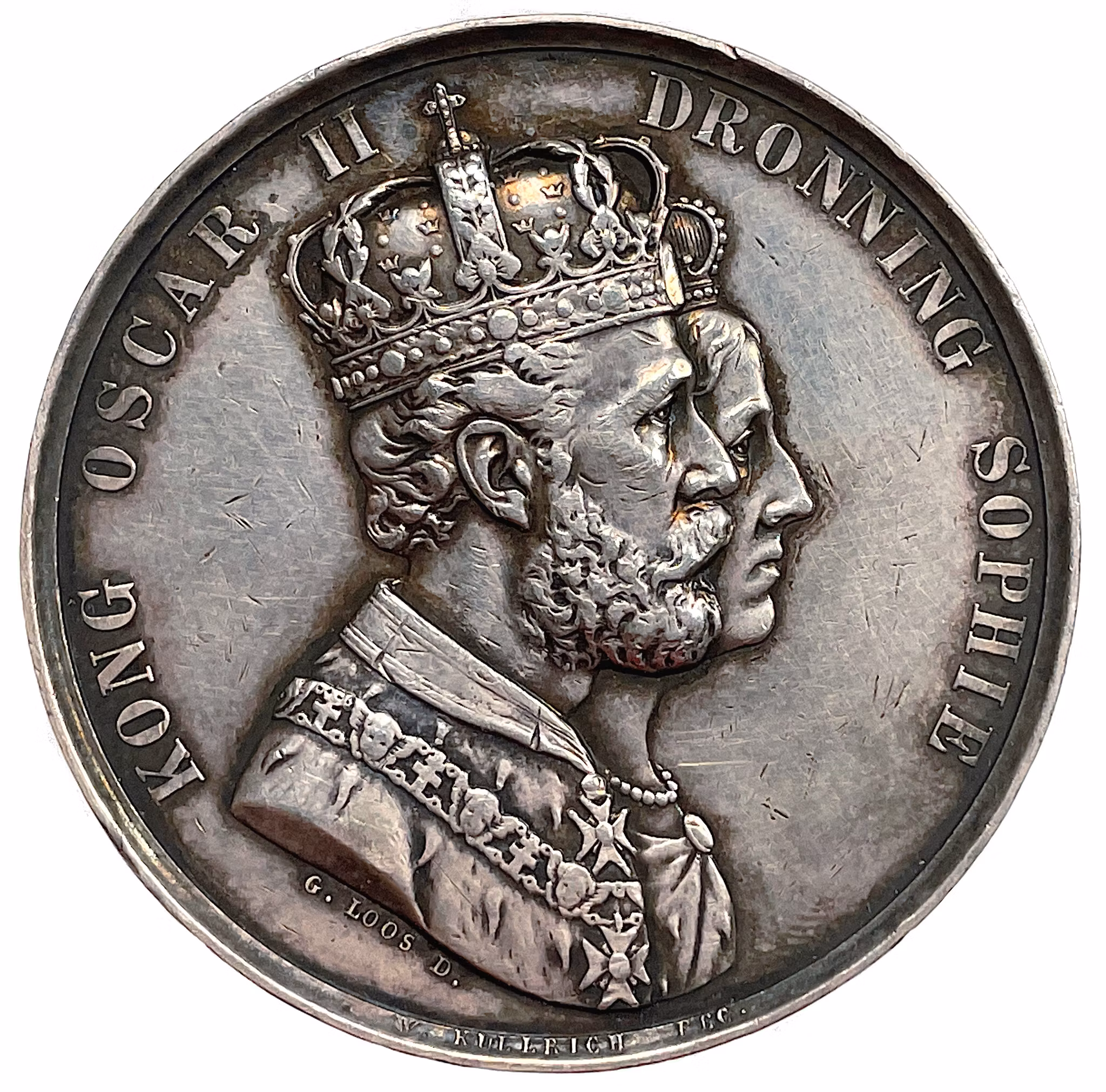 Konungens och drottningens förenade, krönta bröstbilder i hermelinsmantlar; konungens med Serafimerordens kedja över manteln och Karl XIII:ş orden om halsen; drottningens med pärlband och manteln uppfäst genom ett runt smycke. I omskriften: "KONG OSCAR II DRONNING SOPHIE.". Nedanför: "G. LOOS D". På kanten gravörens namn: "W. KULLRICH FEC."