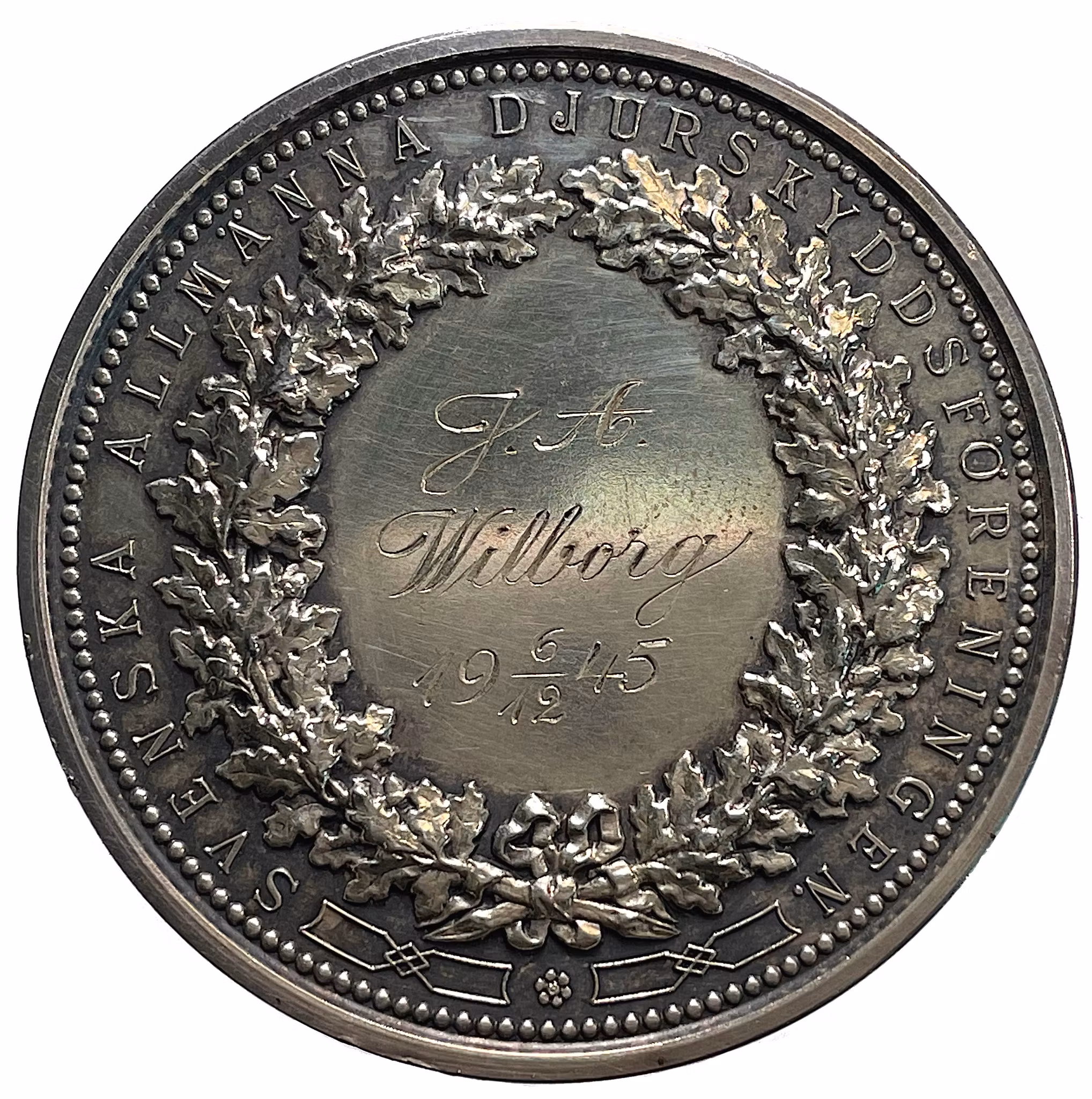 Svenska Allmänna Djurskyddsföreningen tillkom 1875 i Stockholm med ambitionen att vara rikstäckande. Flera av föreningens grundare var veterinärer som ville informera allmänheten om djurvänliga sätt att sköta, frakta och slakta djur. Man ansåg att kunskapsförmedling var det bästa sättet att motverka djurplågeri. Föreningen engagerade sig främst i praktiska djurskyddsfrågor såsom slakt, småfågelskydd samt kreaturstransporter till sjöss och på land. Föreningen har vid enstaka tillfället tilldelat personer belöningsmedaljer som agerat speciellt förtjänstfullt för djurens rätt. Denna medalj modell 1906/1907 har utdelats med oförändrat utseende även under Gustav V:s regeringstid. Detta exemplar utdelat till J. A. Wilborg 6/12 1945, några månader efter 2:a världskriget äntligen tagit slut. Silver, graverad av Adolf Lindberg, 37.7g, 42mm, kvalitet 1+/01, sällsynt