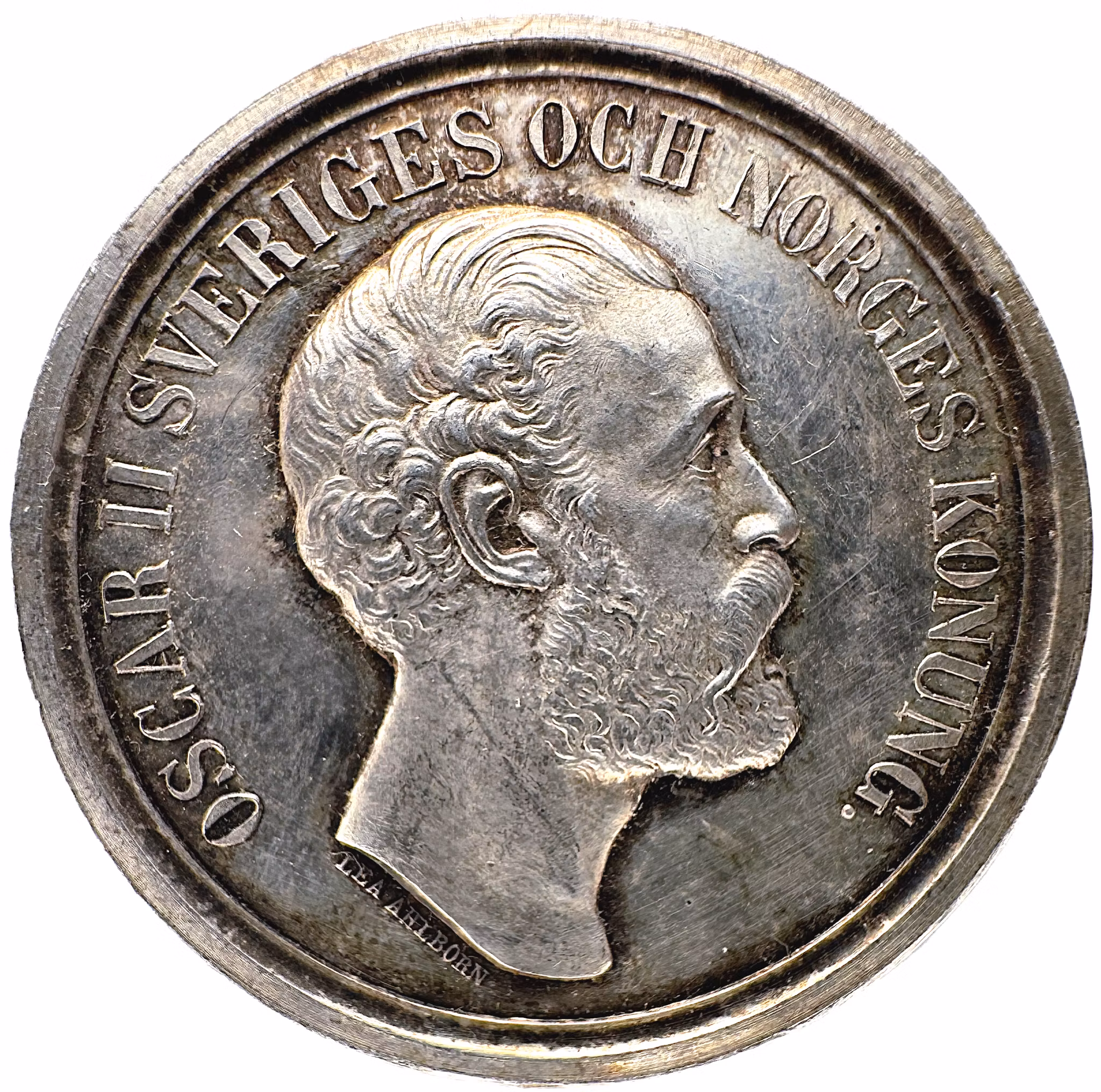 Ett av konungens tidigaste porträtt, vänt åt höger med gravörens namn under bilden: "LEA AHLBORN". I omskriften: "OSCAR II SVERIGES OCH NORGES KONUNG"