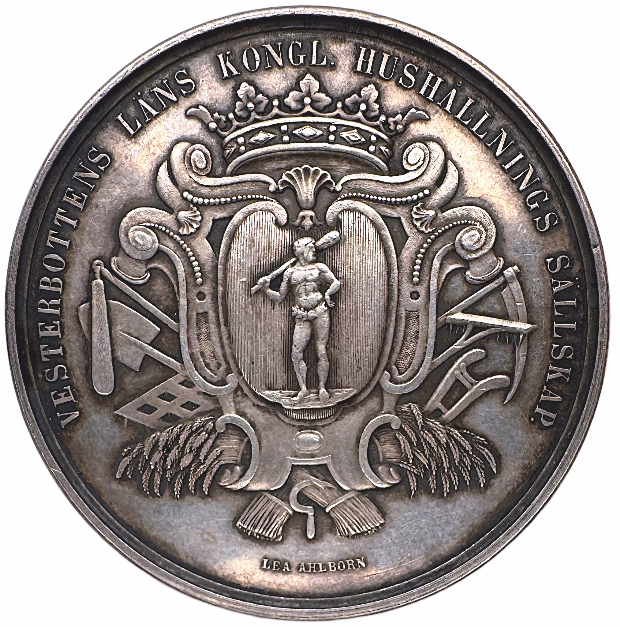 Västerbottens läns hushållningssällskaps emblem. I centrum finns en vapensköld som kröns av en kunglig krona. Skölden avbildar en stående "vilde", en man med en lövkrans runt höfter och hår som håller en klubba över axeln. Detta är landskapet Lapplands heraldiska vapen. Runt skölden finns symboler för lantbruket, till vänster: En slaga, harv och spade, till höger en lie, räfsa och plog. Under skölden: Två kärvar av säd samt ett knippe lin och en skära. I omskriften: "VESTERBOTTENS LÄNS KONGL. HUSHÅLLNINGS SÄLLSKAP". Längst ned gravörens namn: "LEA AHLBORN"