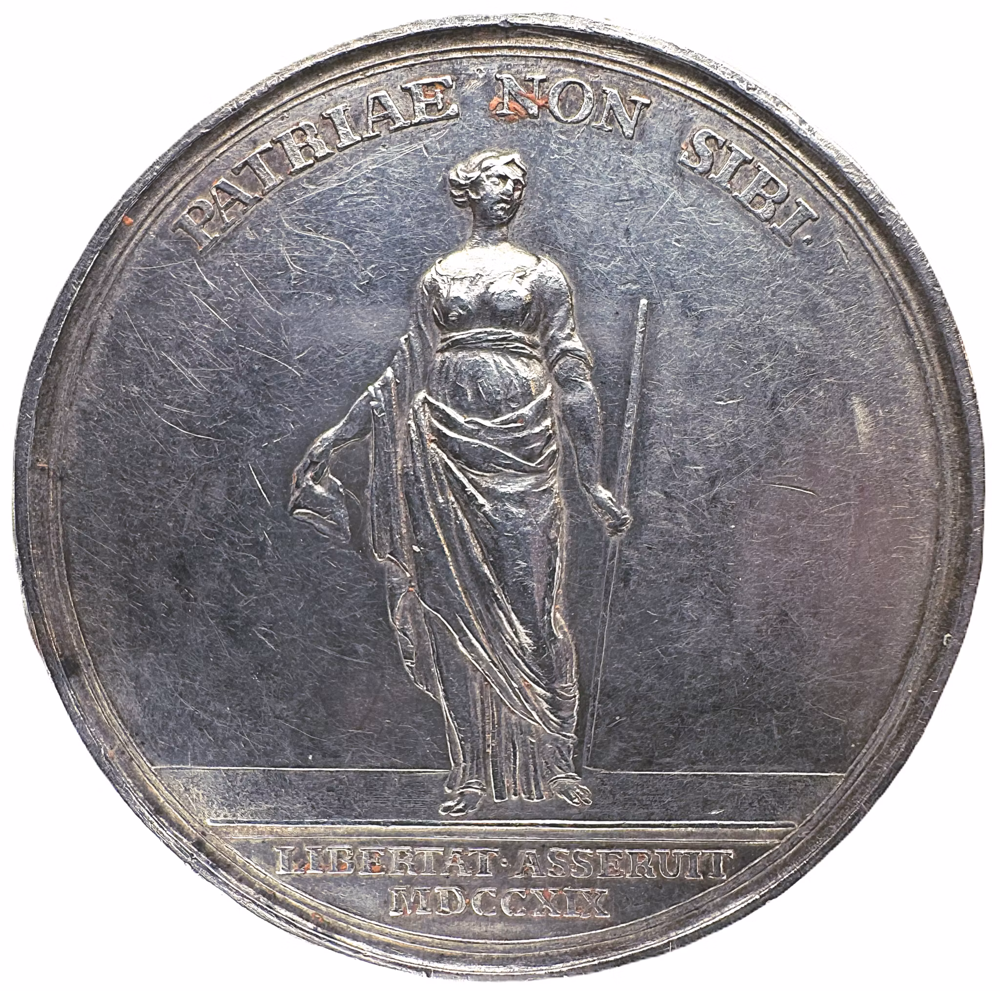 Frihetsgudinnan stående med frihetsmössan i högra handen och en stav i den vänstra. Text överst: "PATRIAE NON SIBI" och i avskärningen på två rader: "LIBERTAT ASSERUIT MDCCXIX". Texten kan översättas som: "För fosterlandet, inte för sig själv, hävdade han friheten 1719."