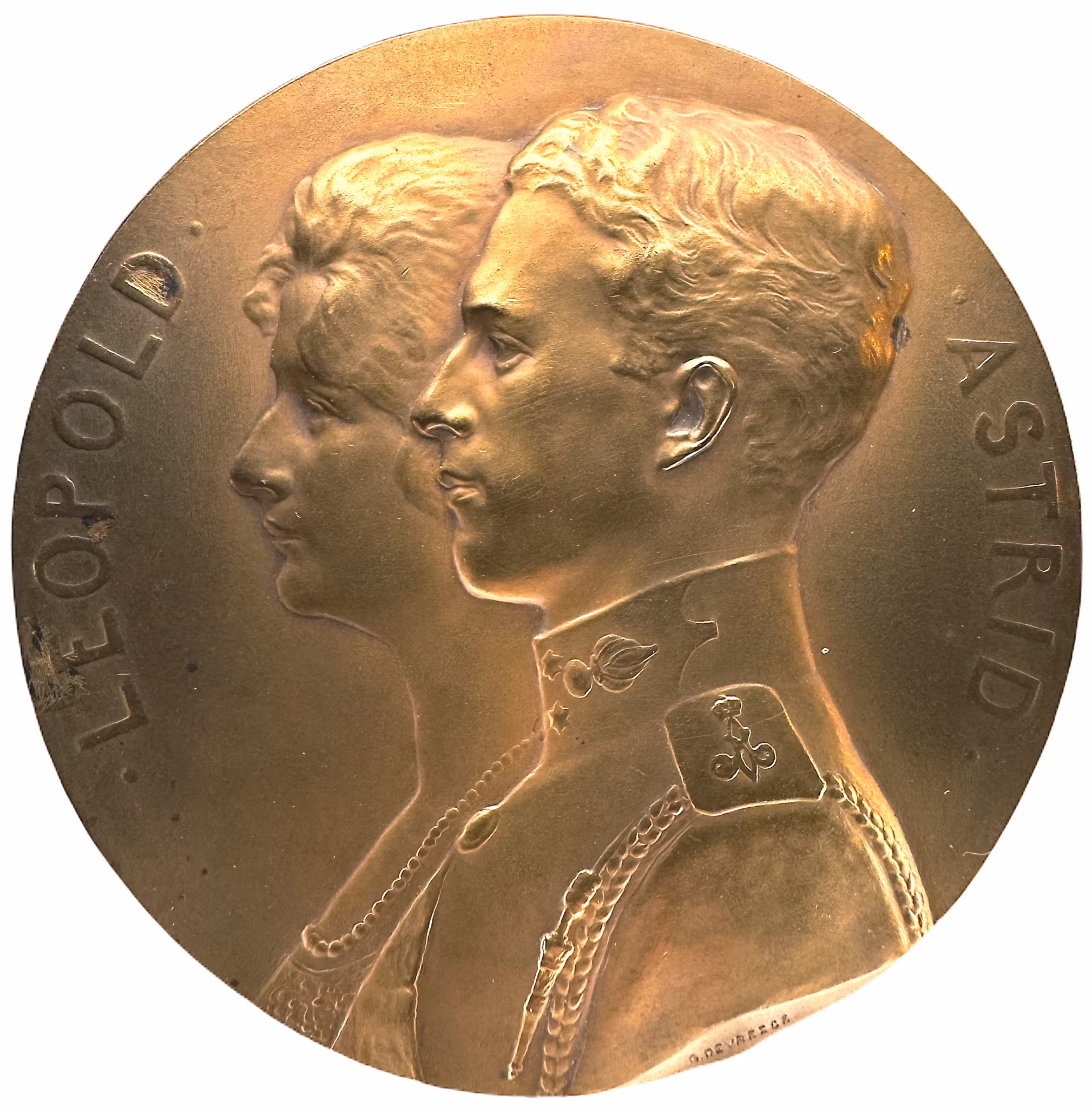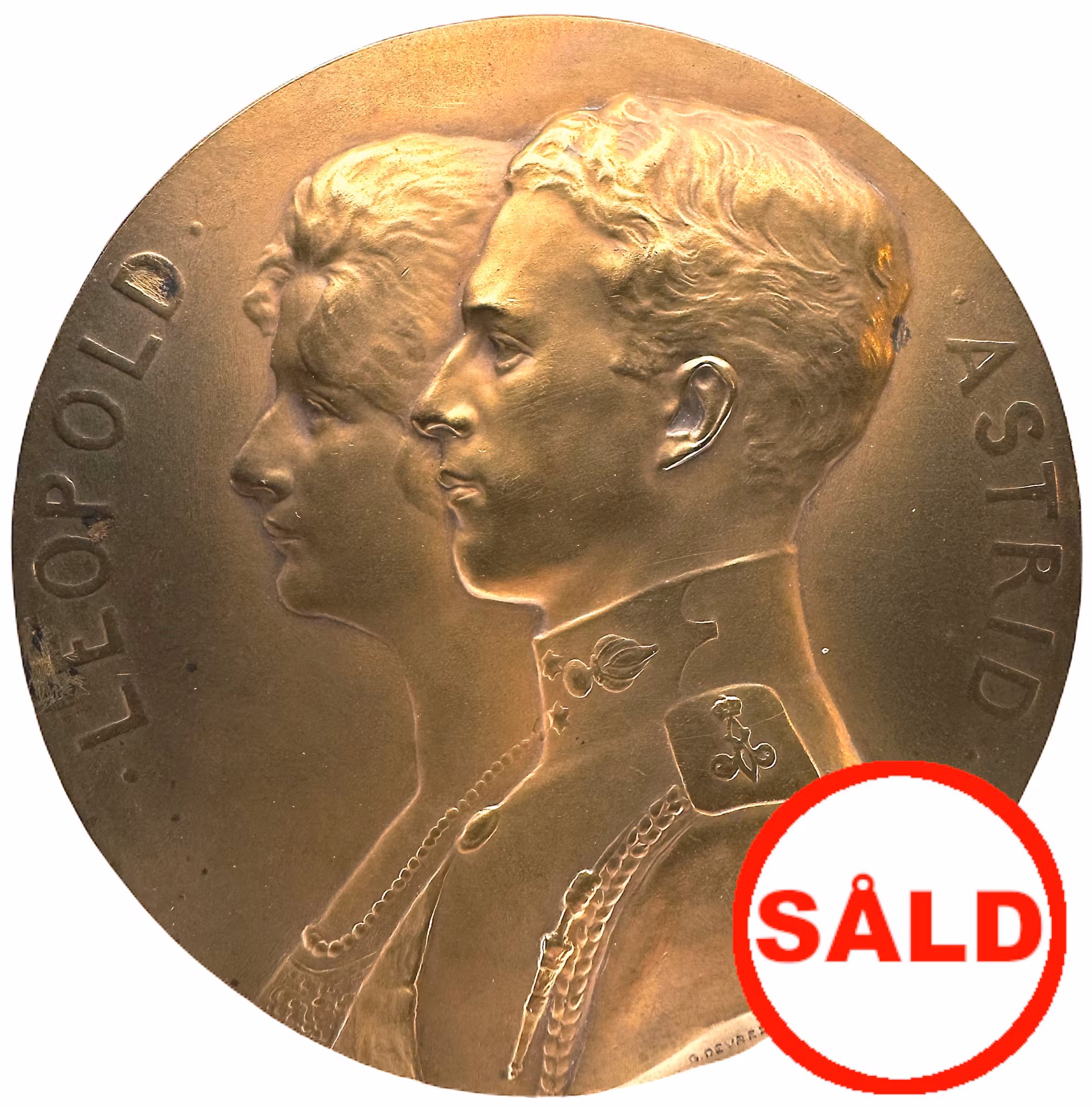 På åtsidan kungaparet Astrid (av Sverige) och Leopold (av Belgien). Utgiven 1926 med anledning av bröllopet. Brons, 121.18g, 70mm, kvalitet 01, mindre märken.