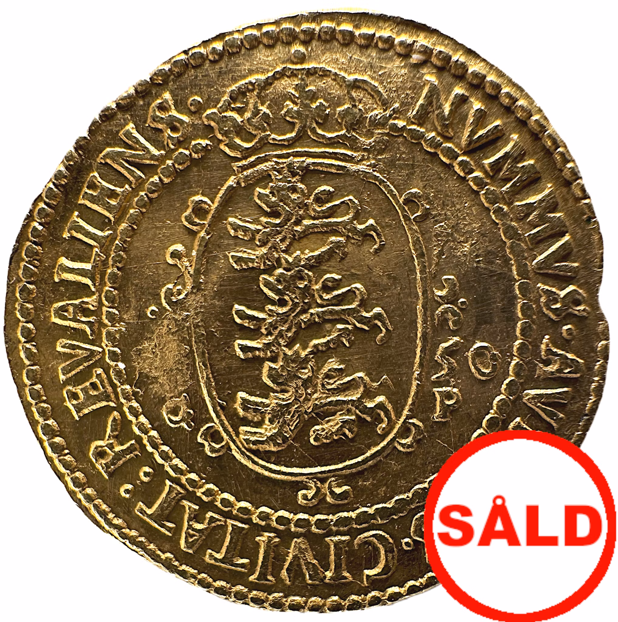 Ett vackert exemplar med full lyster, sedvanlig lätt råhet för dukater präglade i Reval. Litet plantsfel i första årtalssiffrorna på frånsidan. Inga noterade försäljningar, möjligen det enda kända i privat ägo! SG 19, kvalitet 01, 3.48g. Utöver den stora sällsyntheten är myntet särskilt intressant då det är en så kallad ettårstyp, dvs myntet präglades endast 1650. Därtill är det inte bara det enda guldmyntet från Reval under Kristinas regeringstid, utan även det allra första guldmyntet som präglades i staden under svensk överhöghet. Som en sådan numismatisk milstolpe utgör objektet ett absolut måste som uppfyller alla krav för den kräsne samlaren av rariteter.