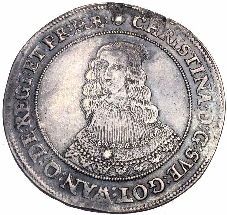 Ett mynt av allra största sällynthet som länge gått "under radarn". Först i och med publiceringen i SVERIGES MYNTBOK 995-2022 uppmärksammades och dokumenterades detta ytterst sällsynta typmynt. Vid pressläggningen hade jag kännedom om fyra exemplar i privat ägo, det här utbjudna torde då vare det femte kända i privat ägo. Myntet har knivskarpa detaljer och jämna fina ytor. Samtliga kända exemplar, inklusive exemplaret i den Antellska samlingen i Helsingfors, uppvisar stampskadorna på kanterna. Detta exemplar, precis som det tidigare exemplaret jag hanterat, har varit monterade. Ett tillfälle för den som jagar numismatiska topprariteter. Kvalitet 1+/01, 27.74g, 44.81mm. SMB 16 (SM-)