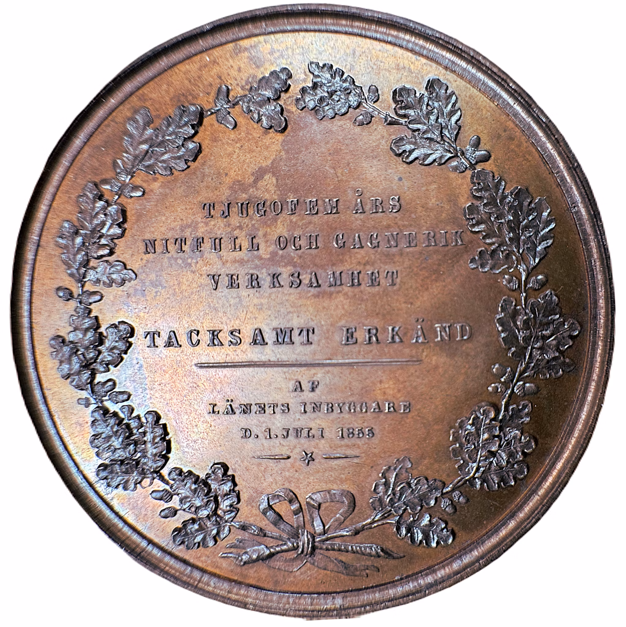 Text på sju rader inom en eklövskrans: "TJUGOFEM ÅRS NITFULL OCH GAGNERIK VERKSAMHET TACKSAMT ERKÄND AF LÄNETS IN- BYGGARE D. 1. JULI 1855 —★—"