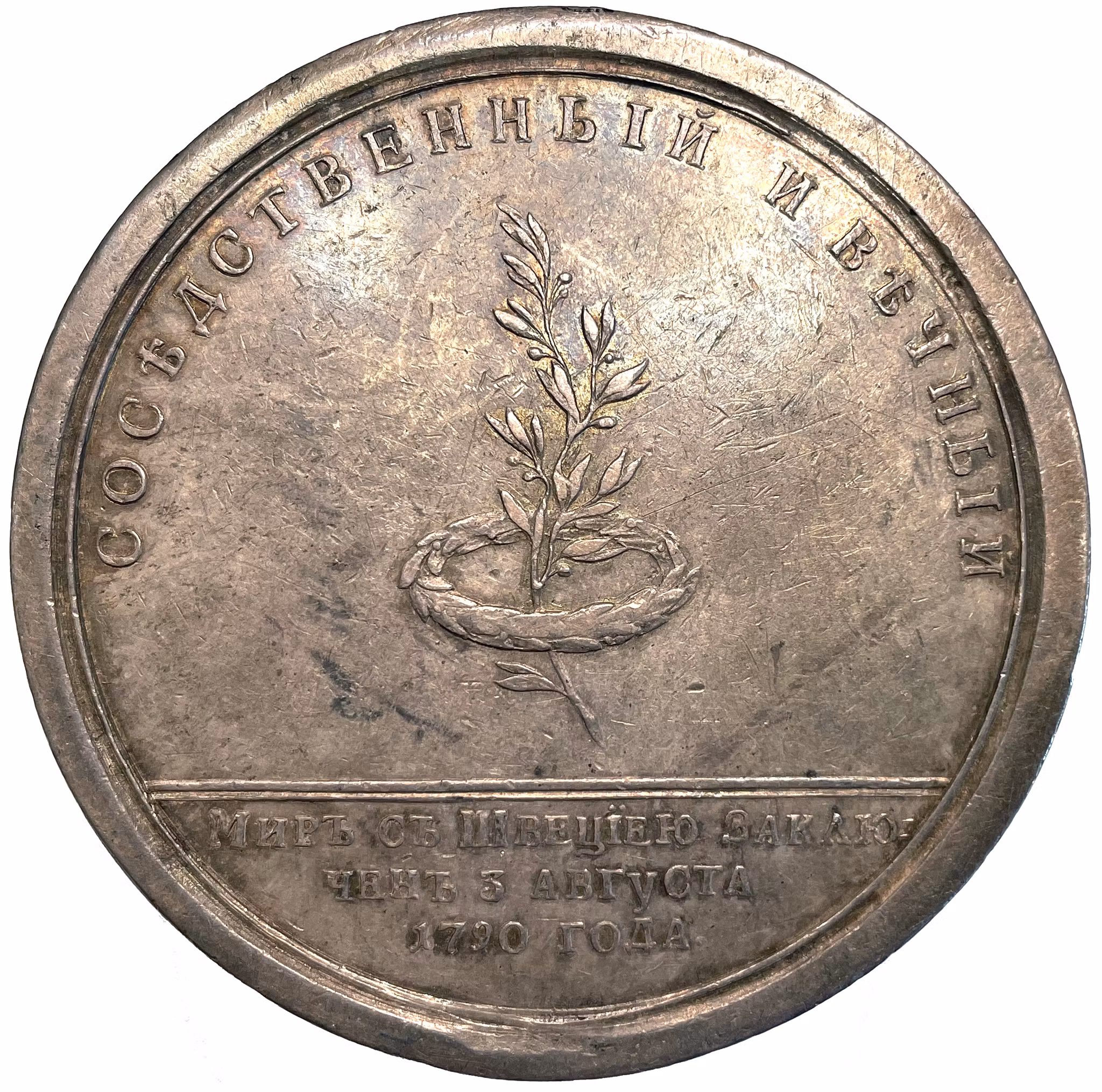 En historisk signifikant och intressant krigsmedalj utiven i Ryssland, graverad av T. Iwanoff och P. W. Gass. På åtsidan Katarinas högervända bröstbild och på frånsidan en olivkvist inom lagerkrans. I avskärningen datum och årtal för freden. Kvalitet 1+, silver, 54,0g, 53mm, Mycket sällsynt