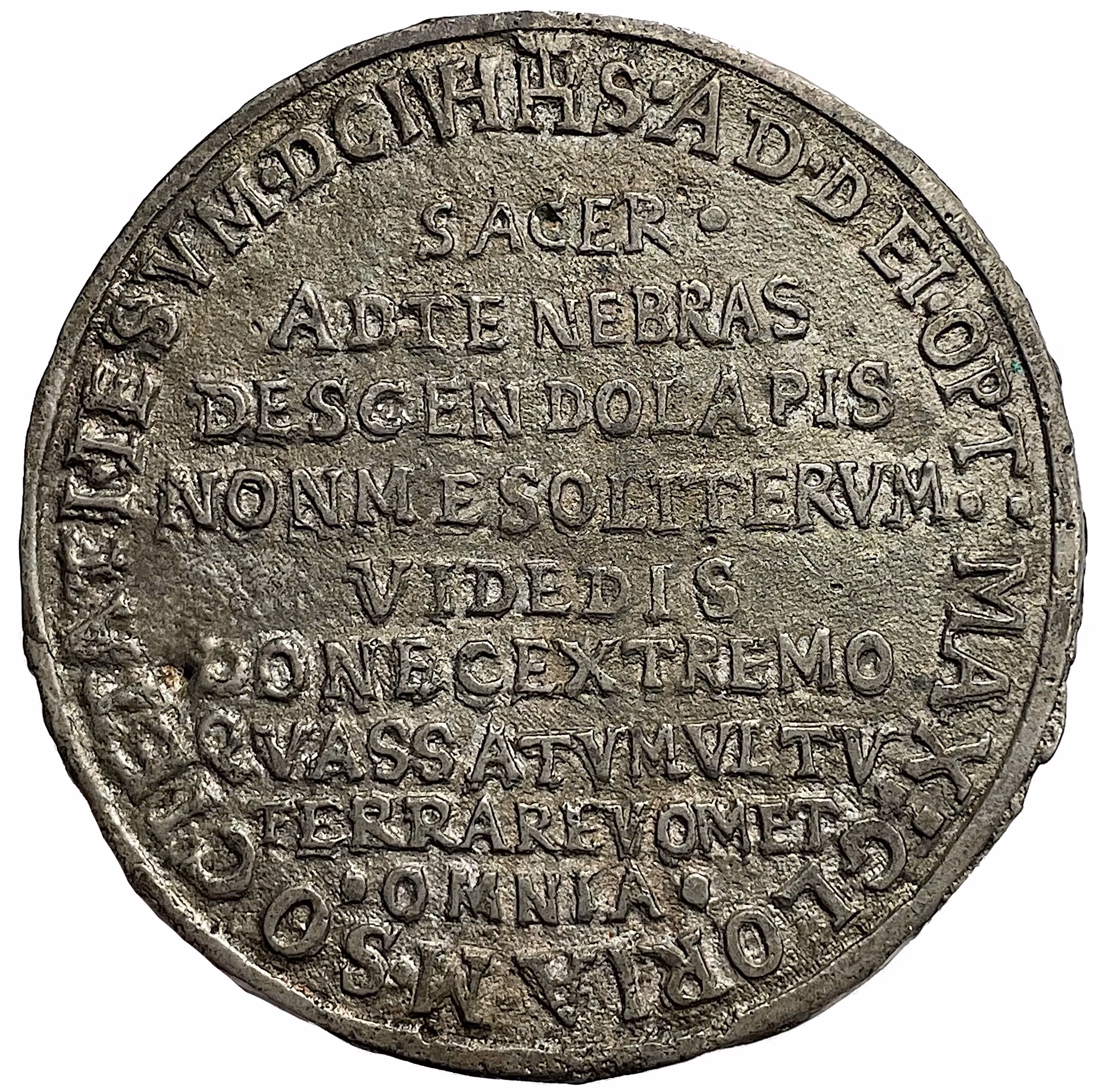 I omskriften: "IHS•AD•DEI OPT:MAX:GLORIAM•SOCIETATI•IESV M•DCIV" och i centrum text på nio rader: " SACER• /ADTE NEBRAS / DESCENDOLAPIS / NON ME SOLITERVM / VIDEDIS / DONEC EXTREMO / QVASSA TVMVLTV / TERRA REVOMET / •OMNIA•". Texten översatt: "Jesus, människornas frälsare. Till Guds, den Högstes ära, åt Jesuiterorden 1604 - Jag, en helig sten, stiger ned till mörkret. Du, o sol, skall icke återse mig, förrän jorden, skakad av den sista hemsökelsen, ger ifrån sig allt."