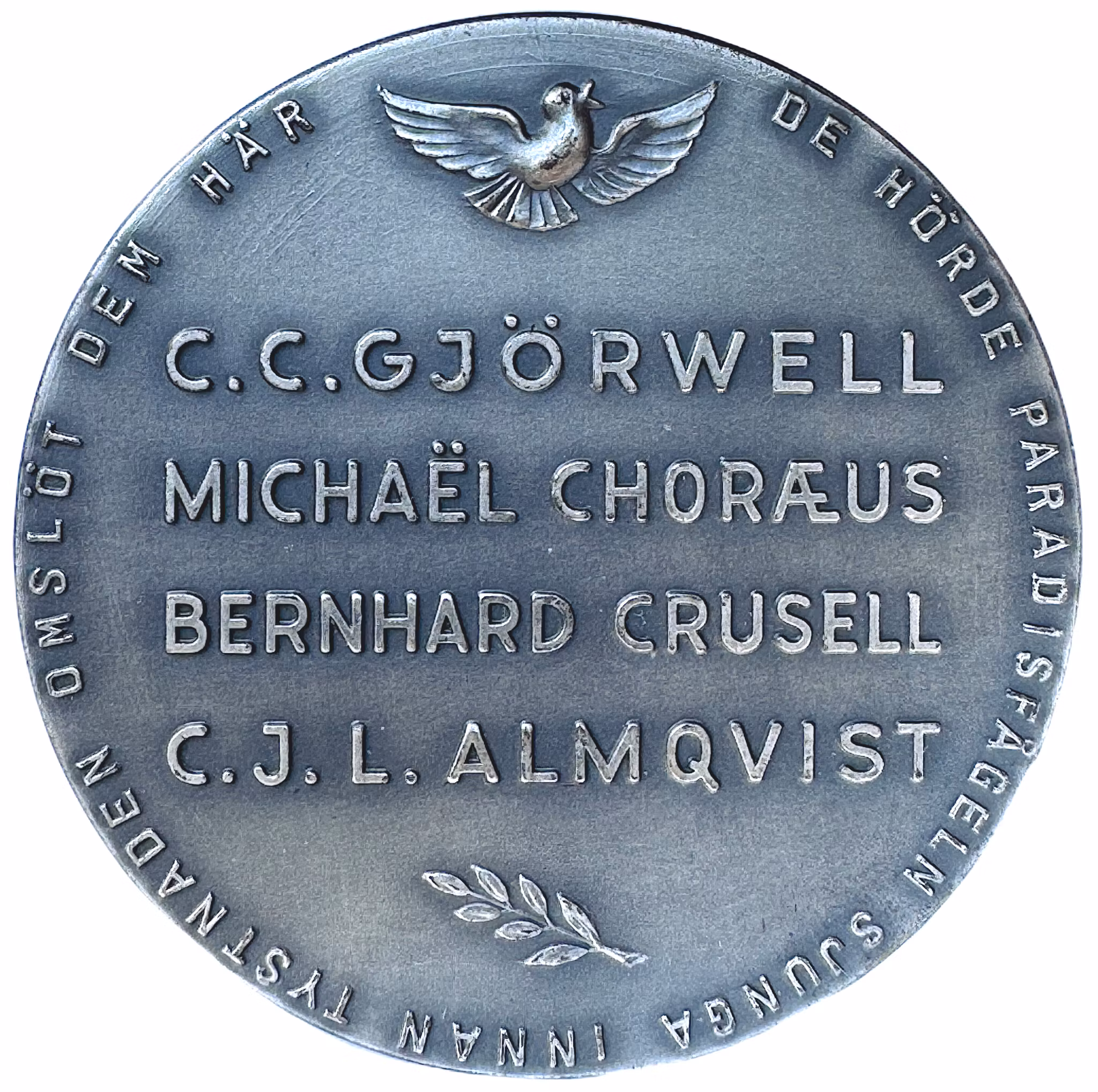 En duva med utslagna vingar över de fyra namnen: "C.C.GJÖRWELL / MICHAËL CHORÆUS / BERNHARD CRUSELL / C.J.L. ALMQVIST", underst en lagerkvist. I omskriften: "DE HÖRDE PARADISFÅGELN SJUNGA INNAN TYSTNADEN OMSLÖT DEM HÄR". Citatet är hämtat från Carl Jonas Love Almqvists roman Det går an som publicerades 1839. Det är en del av Almqvists större verk Törnrosens bok. Almqvist är en av Sveriges mest betydande författare från 1800-talet, och Det går an är en av hans mest kända verk.