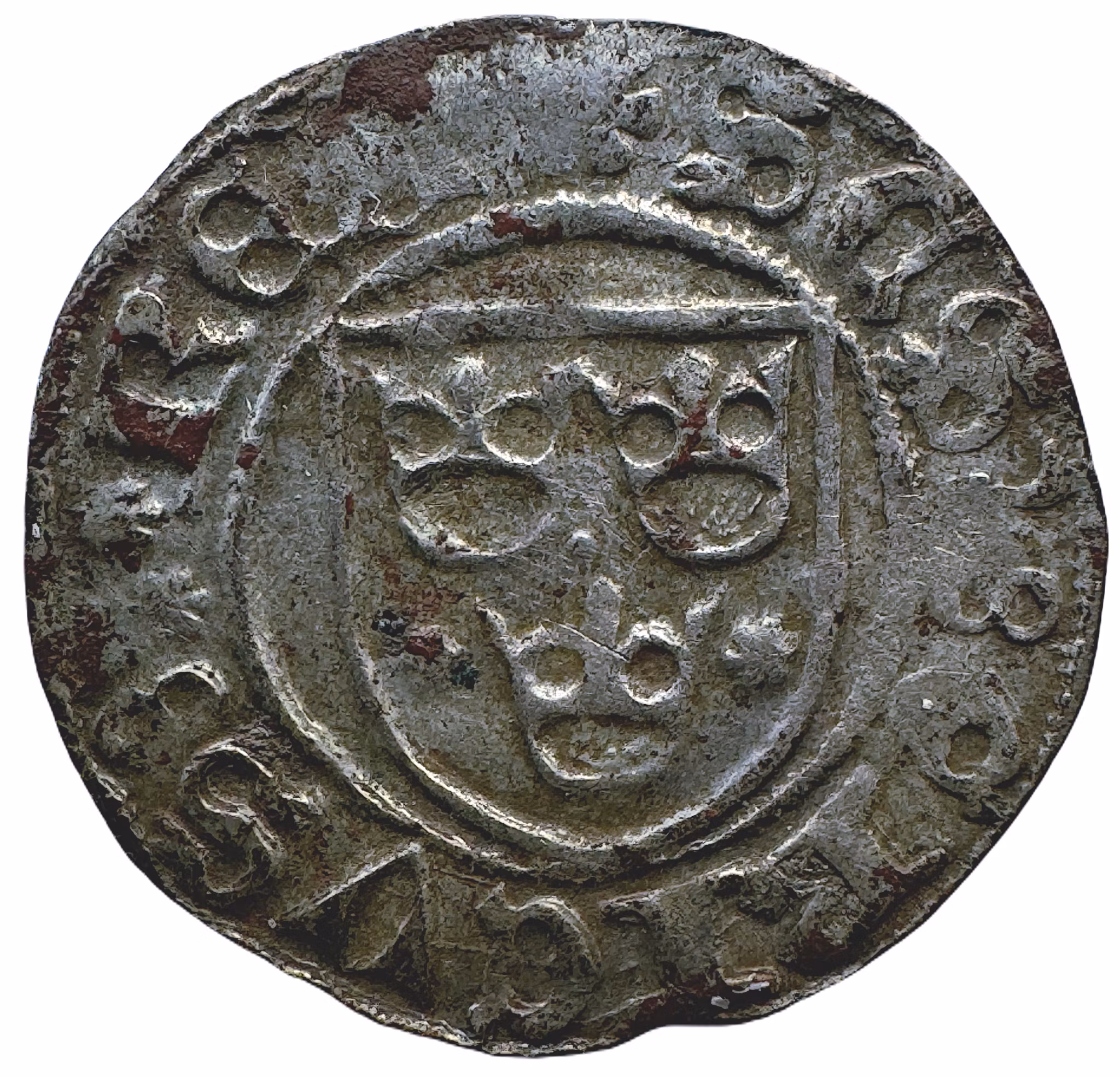 Västerås. Örtug. På åtsidan, trekronorssköld, i omskriften: "SCS ERICVS REX". På frånsidan, krönt uncialt A omgivet av småbladiga rosor, i omskriften:"MONETA AROSIENS". SMB 394, LL 5b. Frösell 234. 1.77 g, obetydligt korrossion, kvalitet cirka 1+