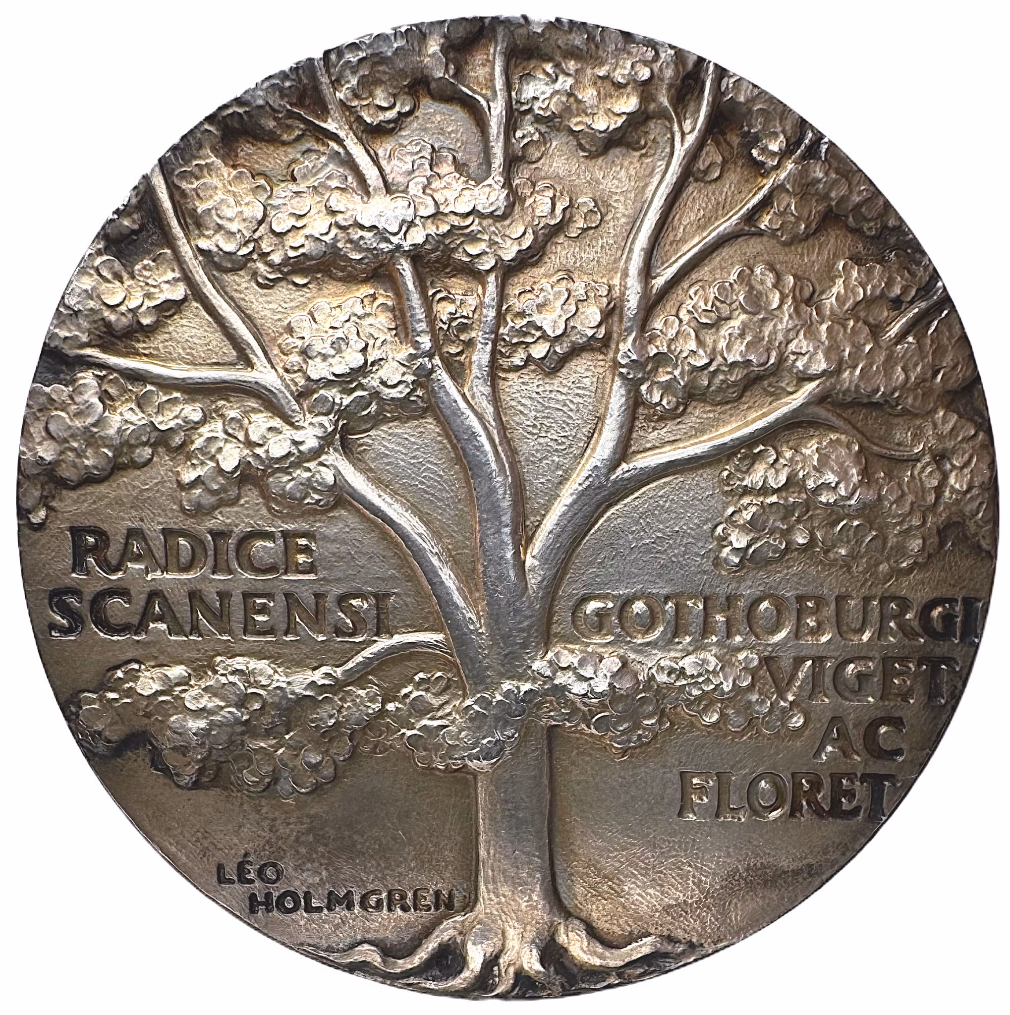 Frånsidan bär ett symboliskt träd, kraftfullt rotat men med vida grenar – en bild av kontinuitet, växt och intellektuell blomstring. Texten lyder: "RADICE SCANENSI GOTHOBURGI VIGET AC FLORET" – Med rötter i Skåne, blomstrar och verkar han i Göteborg. Medaljens konstnärssignatur "LEO HOLMGREN" är diskret placerad till vänster vid trädets rot.